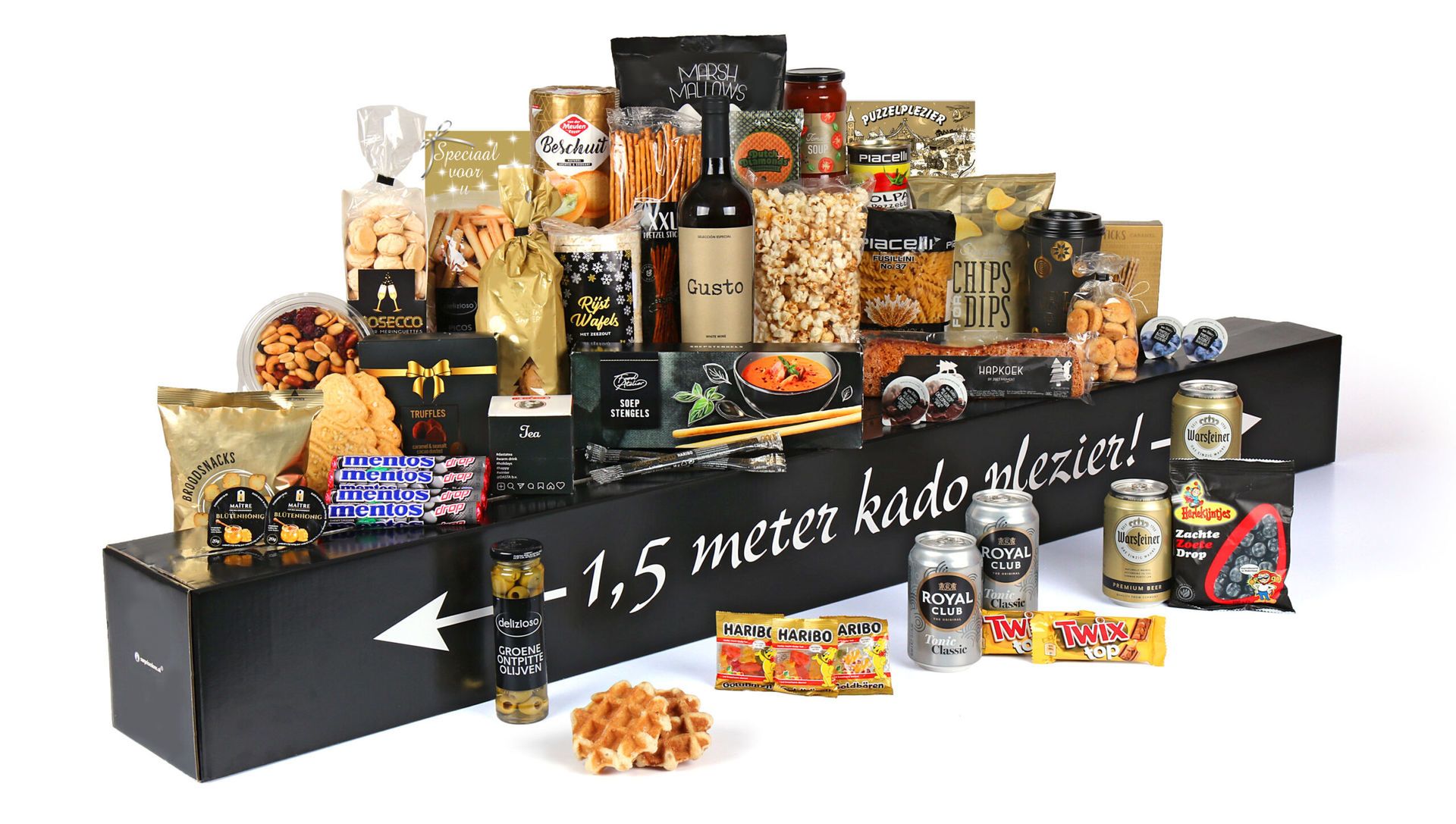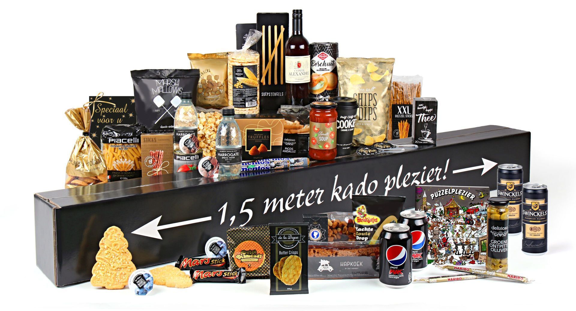 De 1.5 meter luxe genieten® is het ultieme eindejaarscadeau dat indruk maakt. Dit imposante kerstpakket combineert culinaire verwennerij met entertainment en belevenissen in één spectaculaire zwart-gouden verpakking.
