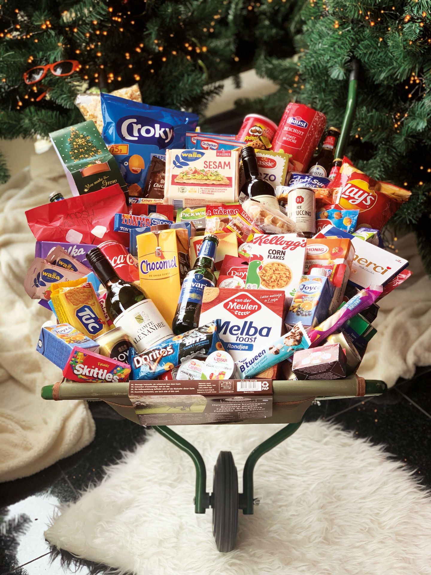 Stel je voor: je opent deze feestelijke kerstdoos en ontdekt een complete kruiwagen vol verrassingen. Van een echte kweekset kerstboom tot hoogwaardige wijnen van Comte Alexander. De kruiwagen bevat premium drankjes zoals Bavaria bier, Coca Cola, Pepsi Max en Joyce multivitamine vruchtensap. Voor de zoetliefhebbers zitten er Tony’s Chocolonely repen, Milka chocolade, Haribo snoep en Daelmans stroopwafels tussen. Ook aan de hartige trek is gedacht met Lay’s chips, Pringles, Duyvis borrelnootjes en Doritos. Praktische kookproducten zoals Honig macaroni, Koopmans bakmeel en Heinz sauzen maken het pakket compleet.