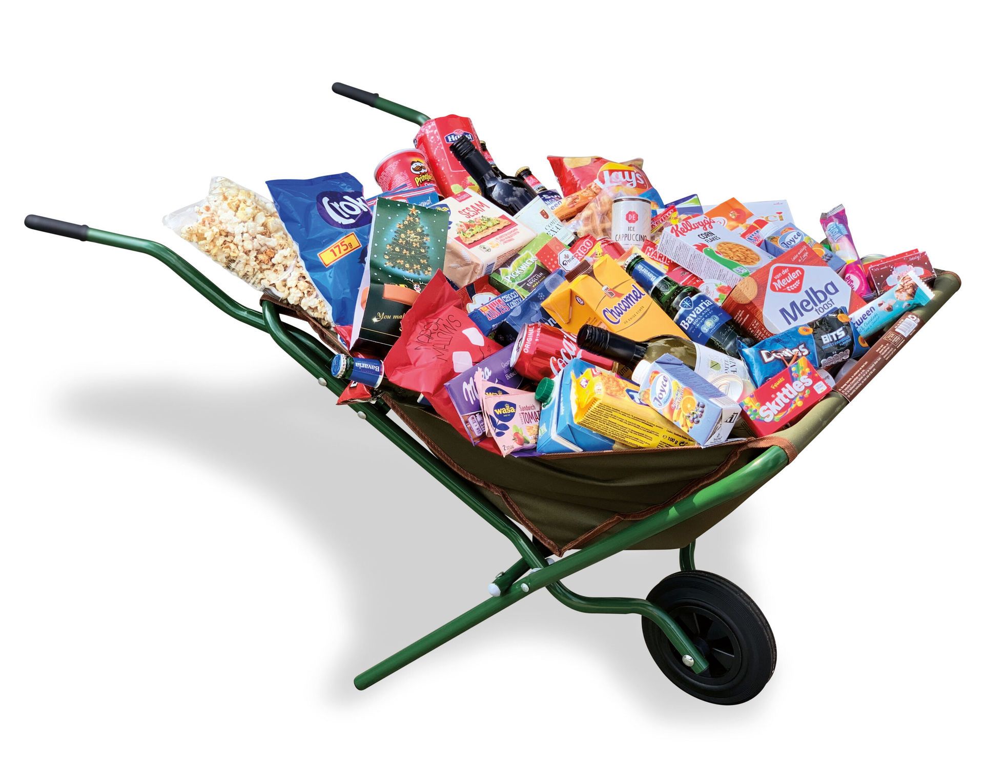 Dit is niet normaal meer! Een kruiwagen gevuld met wel 105 merkartikelen uit de bekendste A-merken. Deze mega gevulde kruiwagen vormt dé klapper onder alle kerstpakketten. De opvouwbare kruiwagen (107 x 69 x 73,2 cm) is ideaal voor in de tuin of op straat en gemakkelijk op te bergen dankzij het inklapbare ontwerp.