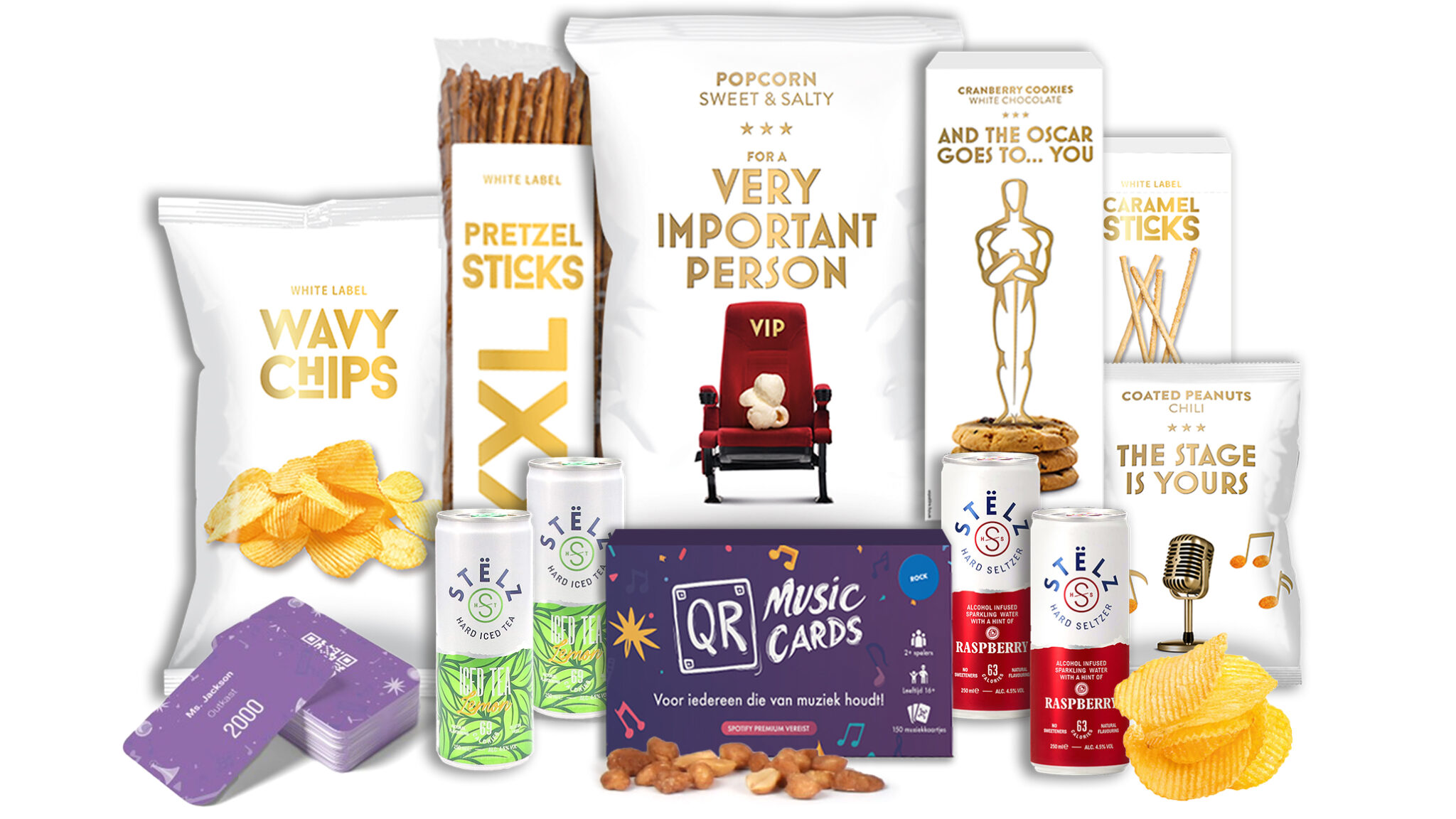 De premium Stëlz drankjes completeren de avond met hun verfrissende smaak. De hard iced tea lemon en hard seltzer raspberry zorgen voor de perfecte balans tussen smaak en verfrissing. Daarnaast vind je een zorgvuldig geselecteerde mix van snacks: van knapperige ribbelchips en popcorn tot luxe cranberry koeken met witte chocolade en hartige borrelnoten.
