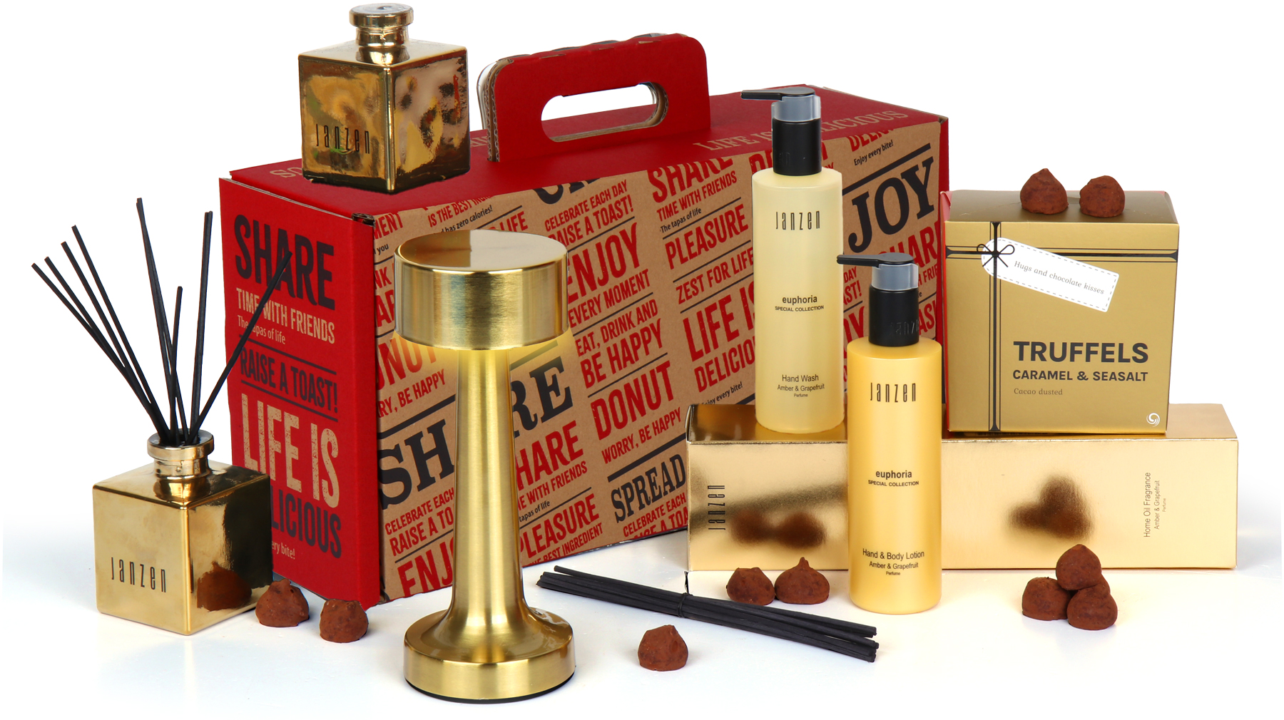 De Janzen Euphoria-collectie vormt het hart van dit pakket. De handwash van 250 ml zorgt voor een luxe wasbeurt, terwijl de bodylotion je huid zijdezacht maakt. De 200 ml diffuser verspreidt de kenmerkende Euphoria-geur door je hele ruimte. Deze geur staat bekend om zijn warme en uitnodigende karakter.