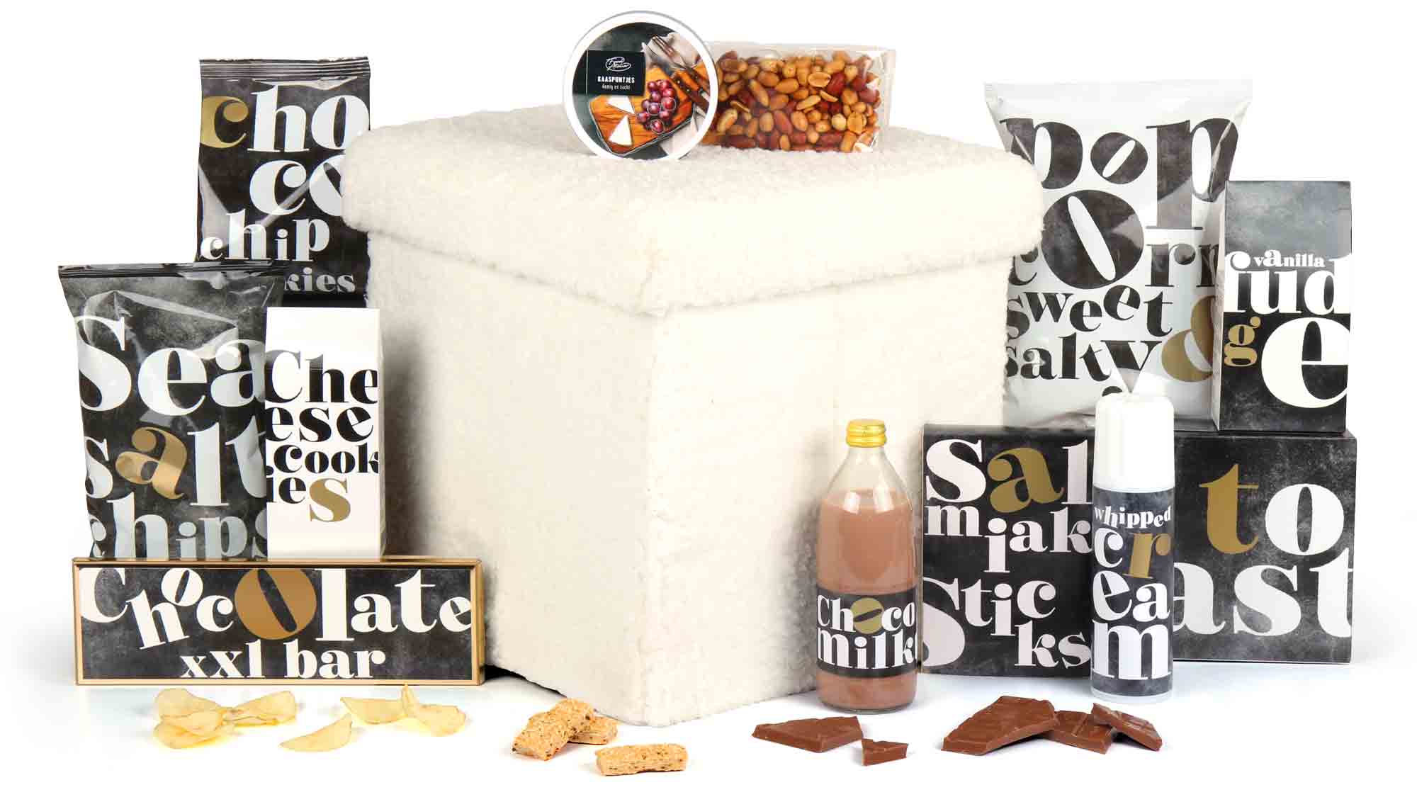 De Black & White lijnproducten maken dit pakket extra bijzonder. Je ontvangt een XXL melkchocoladereep van 225 gram, perfecte chocomelk met slagroom voor warme winteravonden, en knapperige chocolate chip koekjes. Voor de zoetliefhebbers zijn er salmiak dropstaafjes en vanille fudge toegevoegd. De hartige kant wordt vertegenwoordigd door zeezout chips, toast, kaaskoekjes en popcorn.