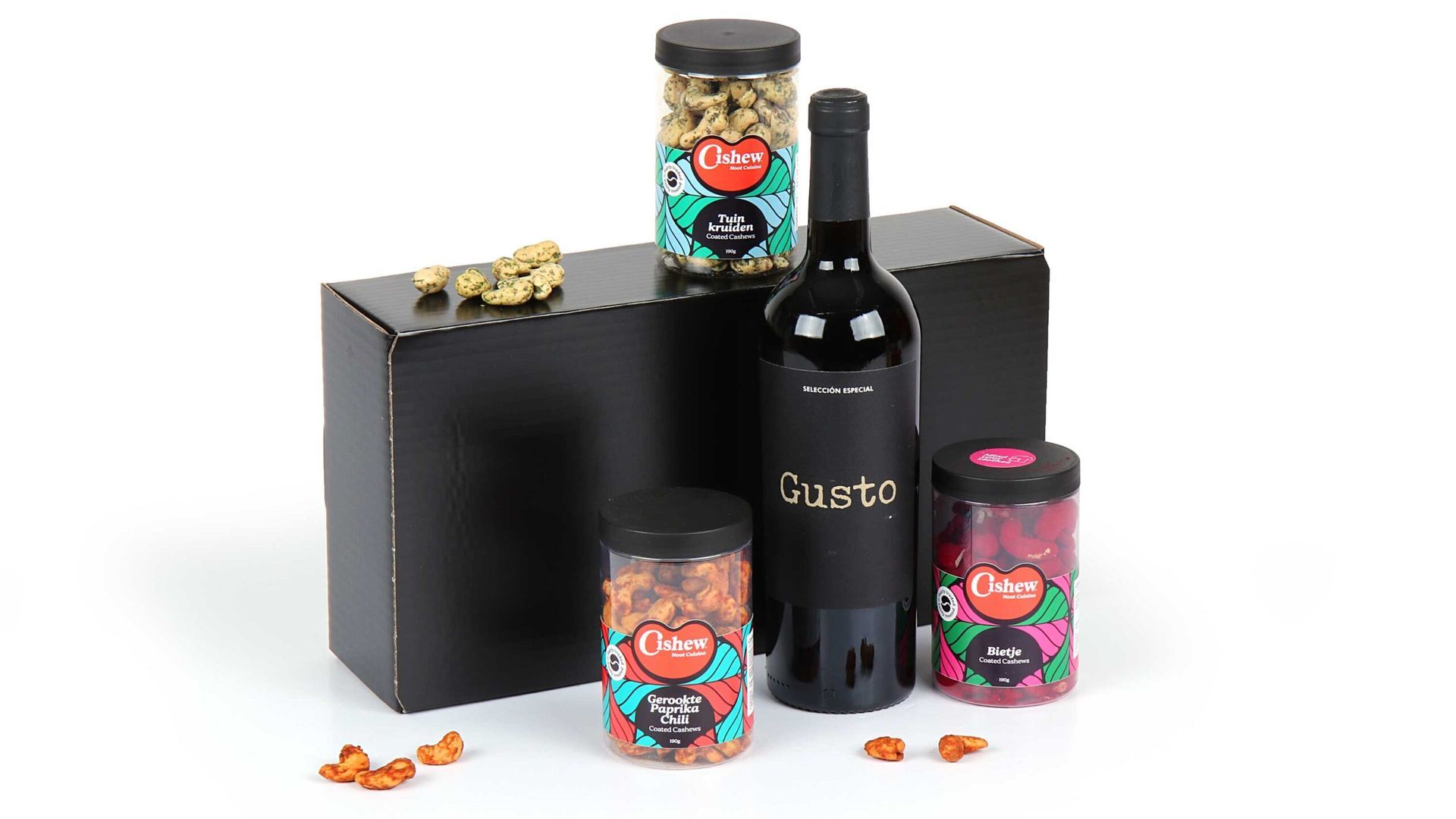 De Gusto Tinto rode wijn vormt de basis van deze ervaring. Deze aangename Temperanillo wijn biedt doordrinkbare kwaliteit met natuurlijke aroma’s van aardbeien en pruim. Daarnaast ontdek je drie unieke Cishew varianten die de Nederlandse notenwereld op zijn kop zetten. De bietje variant verleidt met zijn dieprode kleur, terwijl gerookte paprika chili warmte toevoegt aan je smaakbeleving. De tuinkruiden variant completeert het trio met mediterrane frisheid.
