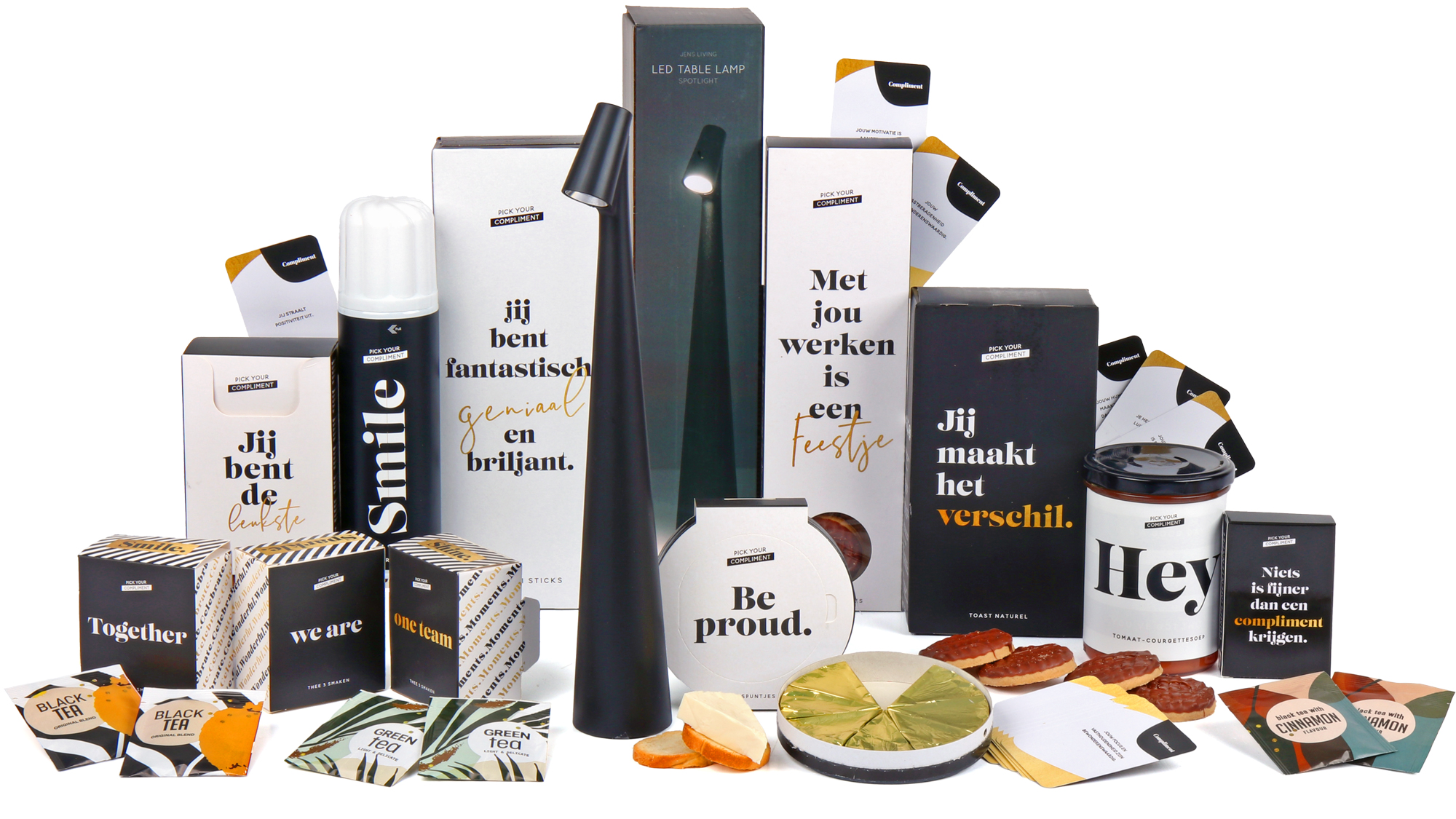 Het Complimenten voor jou kerstpakket combineert waardering met gezelligheid in een stijlvolle zwart-witte uitvoering. Dit doordacht samengestelde pakket toont op een speelse manier dat jouw collega’s, medewerkers of relaties goud waard zijn.