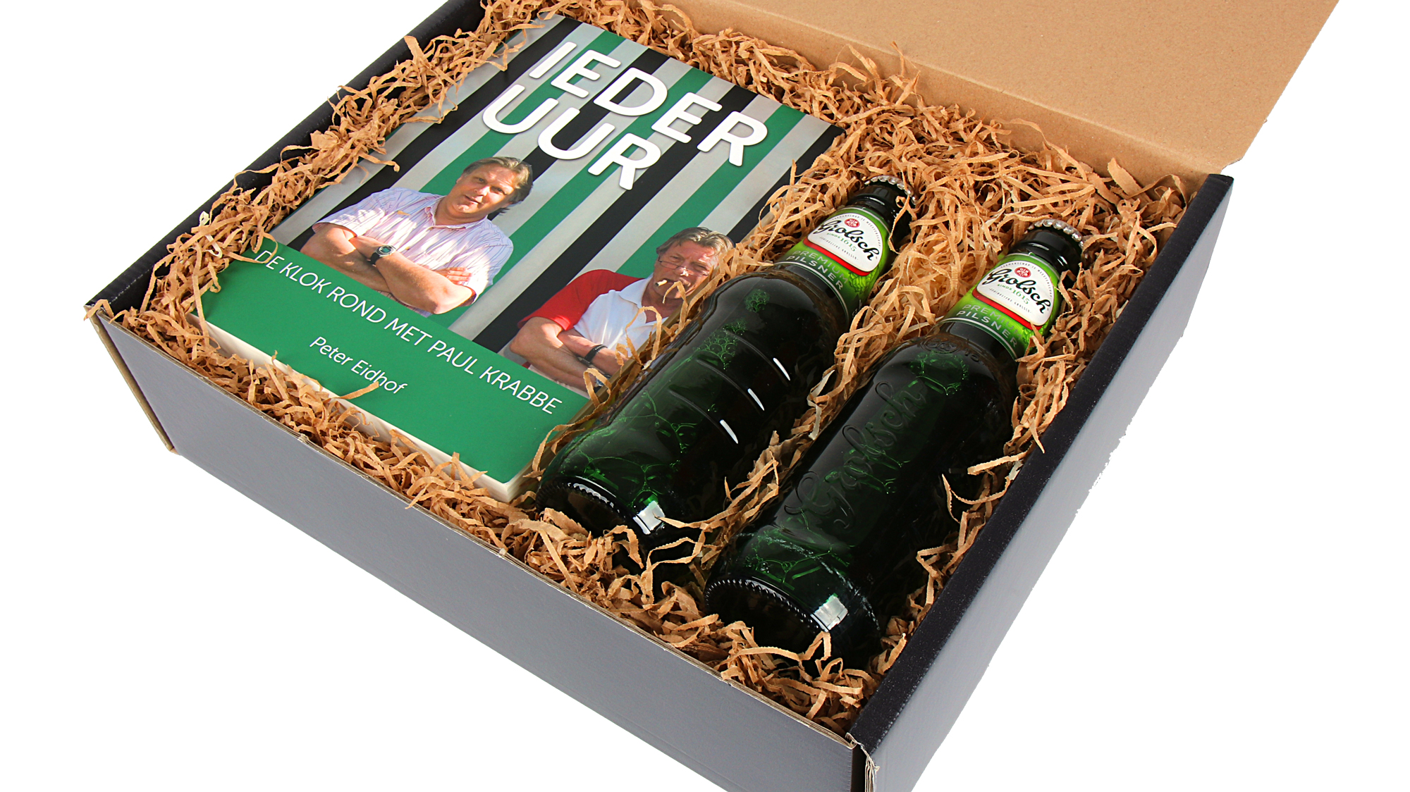 Naast het boek ontvang je twee flessen Grolsch Pilsener van 30 cl. Dit lokale bier past perfect bij het Twentse karakter van het pakket. Alles wordt geleverd in een feestelijke geschenkdoos die het pakket compleet maakt.