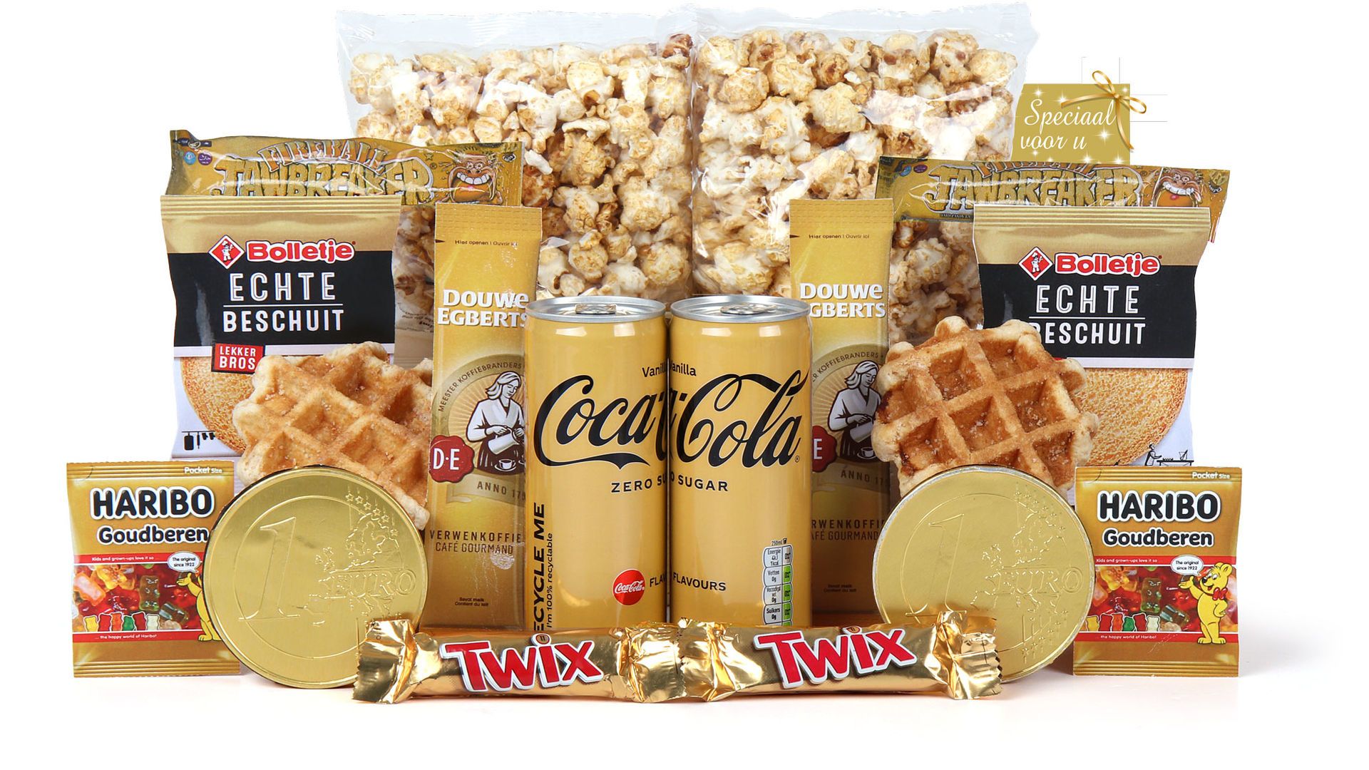 Het Dubbel Goud kerstpakket is dé perfecte keuze voor werkgevers die hun medewerkers willen verrassen met een compleet kerstpakket dat letterlijk dubbel zoviet. Dit stijlvolle pakket in gouden tinten bevat van elk product twee stuks, zodat je alles kunt delen of gewoon dubbel kunt genieten.