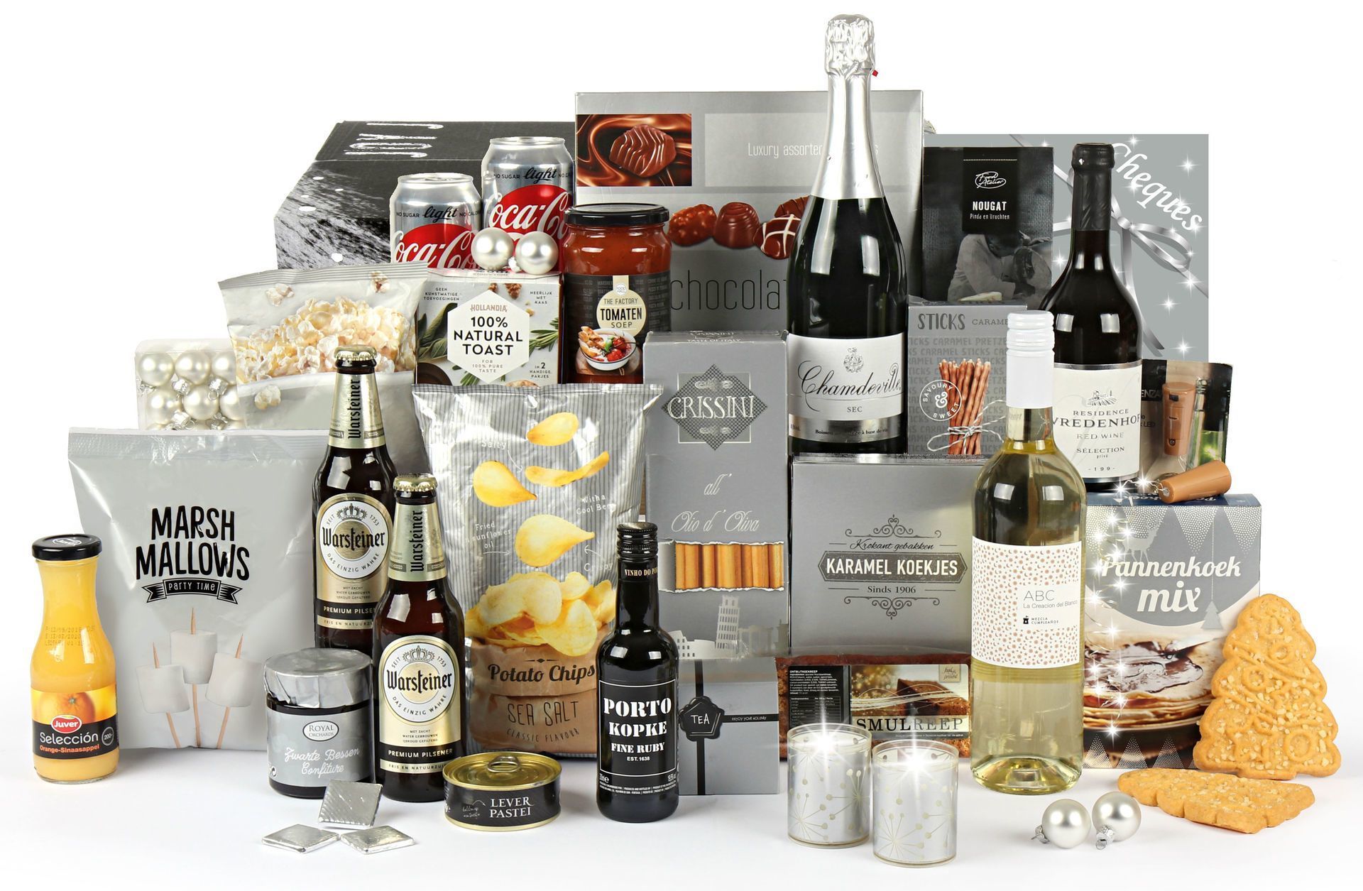 Het pakket bevat een uitgebreide selectie dranken waaronder Chamdeville mousseux sec voor de bubbels, Warsteiner bieren en diverse wijnen van rode tot witte varianten. Voor de gezellige momenten zorgen de marshmallows, luxe bonbons en Jimmy’s popcorn. De sparkle lights met led bottle cork creëren de perfecte sfeerverlichting, terwijl de 24 zilveren kerstballen van 25mm je kerstboom compleet maken.