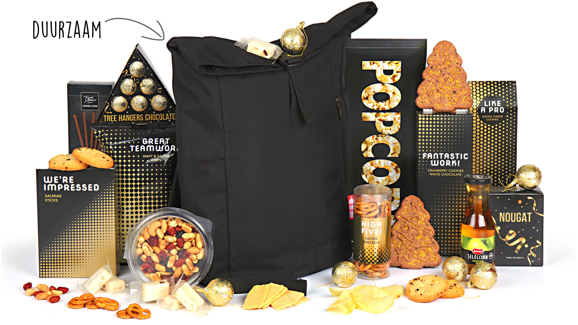 De stevige rolltop rugzak bevat een zorgvuldig samengestelde mix van zoete en hartige lekkernijen. Van knapperige ribbelchips en kaaskoekjes tot zachte nougat en chocolade kerstballen – elk product draagt bij aan de feestelijke ervaring. De cranberry-witte chocolade koeken en choco kerstbomen geven het pakket extra kerstsfeer, aangevuld met klassiekers zoals dropstaafjes, popcorn en een notenmelange.