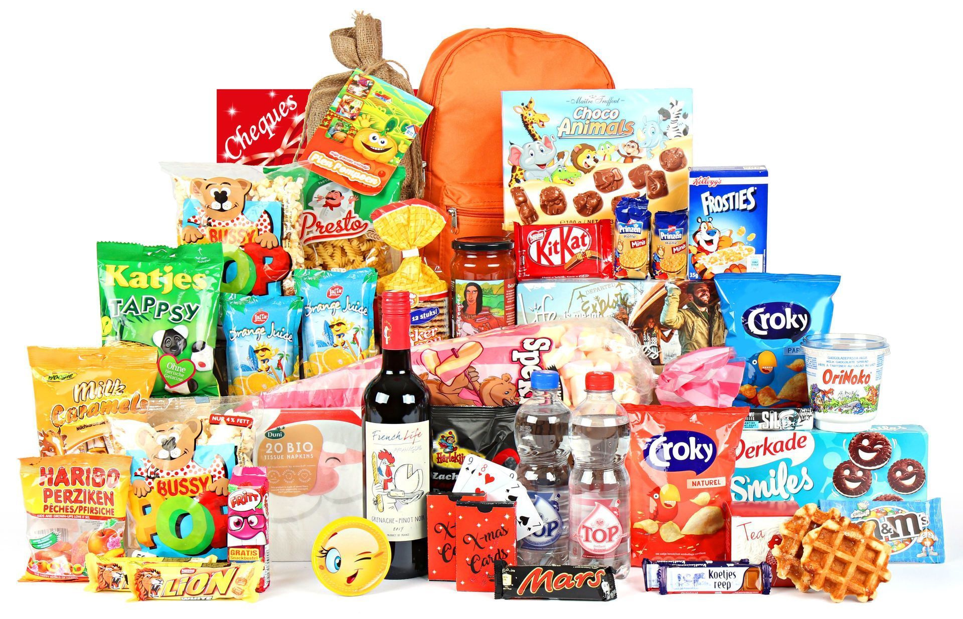 Het avontuur begint met een opvallende oranje rugzak die direct de aandacht trekt. Binnenin ontdek je een zorgvuldig samengestelde mix van lekkernijen die elk moment kunnen verrassen. Van knapperige Croky chips en zoete popcorn tot internationale favorieten zoals Mars en KitKat. De Verkade koekjes met vrolijke smiles symboliseren perfect waar dit pakket voor staat.