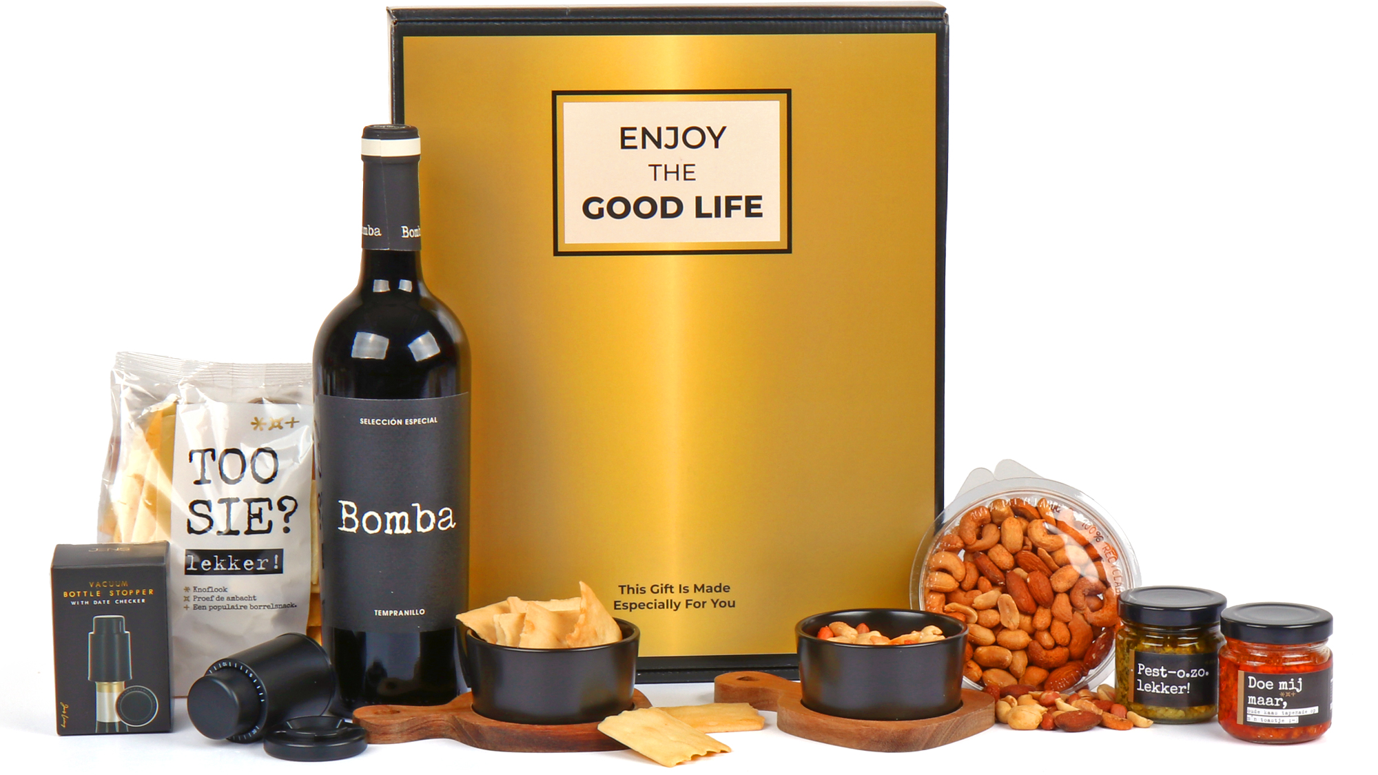 Het hart van dit pakket wordt gevormd door de Bomba Tempranillo, een volle rode wijn van 75 cl die perfect samengaat met de bijgeleverde delicatessen. De Jens Living vacuüm flessenstopper zorgt ervoor dat je de wijn optimaal kunt bewaren na opening. Voor de perfecte presentatie ontvang je twee elegante Jens Living bits & bites schaaltjes die ideaal zijn voor het serveren van de lekkernijen.