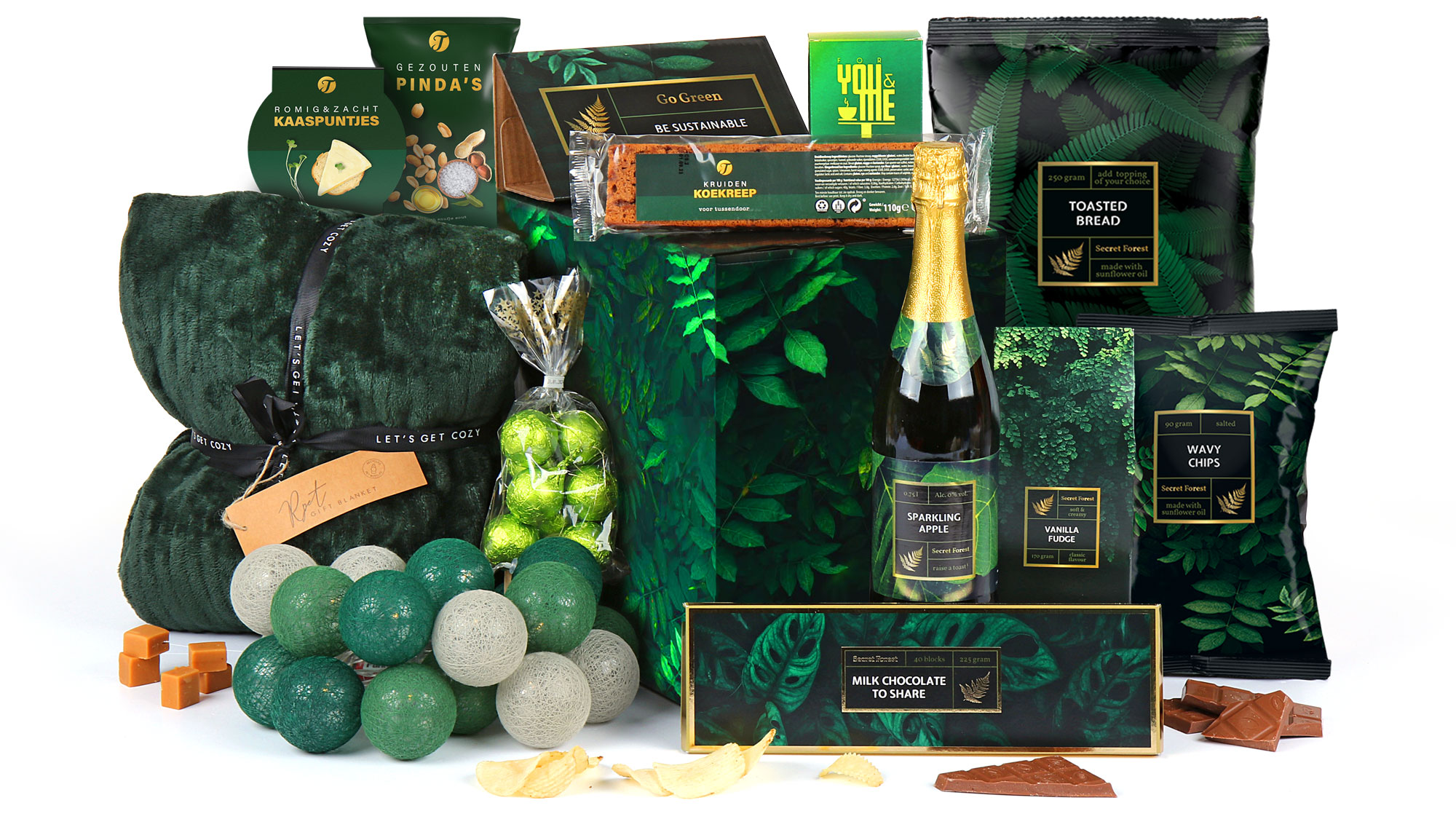 De zachte Senza groene plaid van gerecycled PET-materiaal creëert direct de perfecte kerstsfeer. Daarnaast zorgt de bijpassende Senza lichtslinger in cozy groen formaat voor warme winteravonden. Het Secret Forest assortiment vormt het culinaire hart van dit pakket: van de rijke vanille fudge van 170 gram tot de XXL melkchocoladereep van 225 gram. De bruisende sparkling apple van 75 cl biedt een alcoholvrije feestelijke toast.