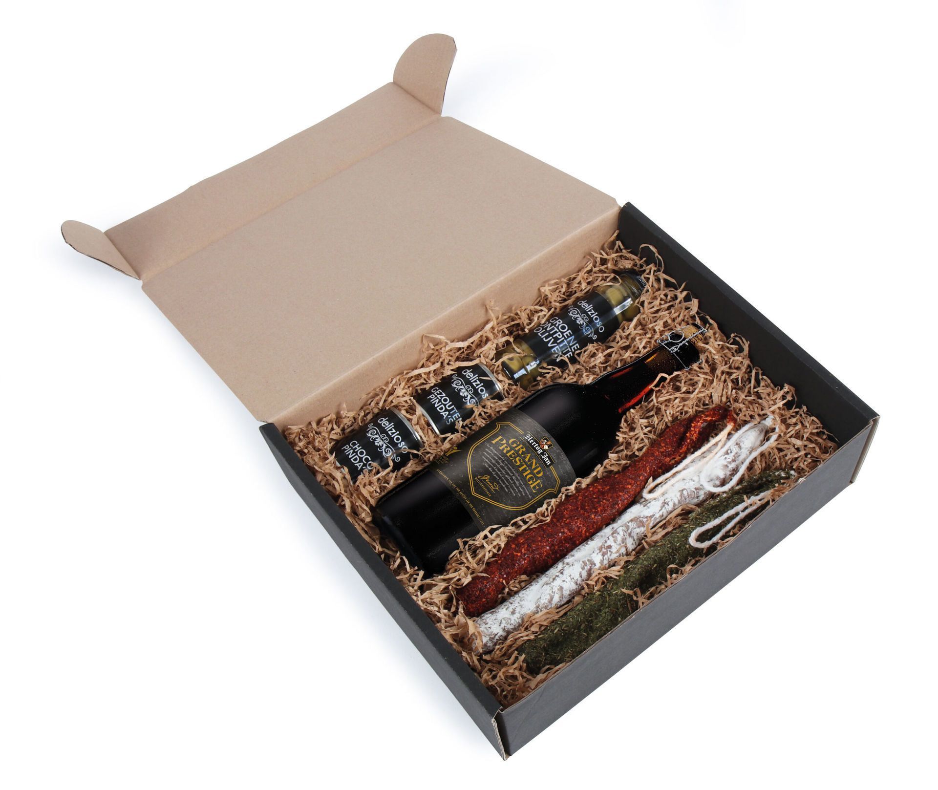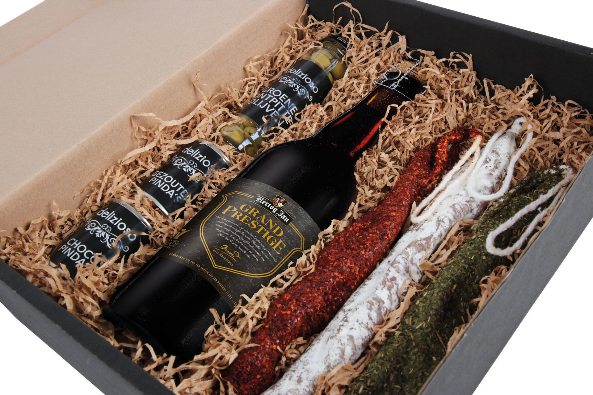 Dit geschenkpakket wordt aangevuld met drie verschillende fuet worstjes: de klassieke variant (150 gr), een versie met fijne kruiden (150 gr) en een pittige variant met chilipeper (150 gr). De Delizioso selectie omvat groene ontpitte olijven (140 gr), gezouten pinda’s (60 gr) en chocolade pinda’s (60 gr). Deze combinatie zorgt voor een harmonieuze smaakervaring die perfect complementeert met het Grand Prestige bier.