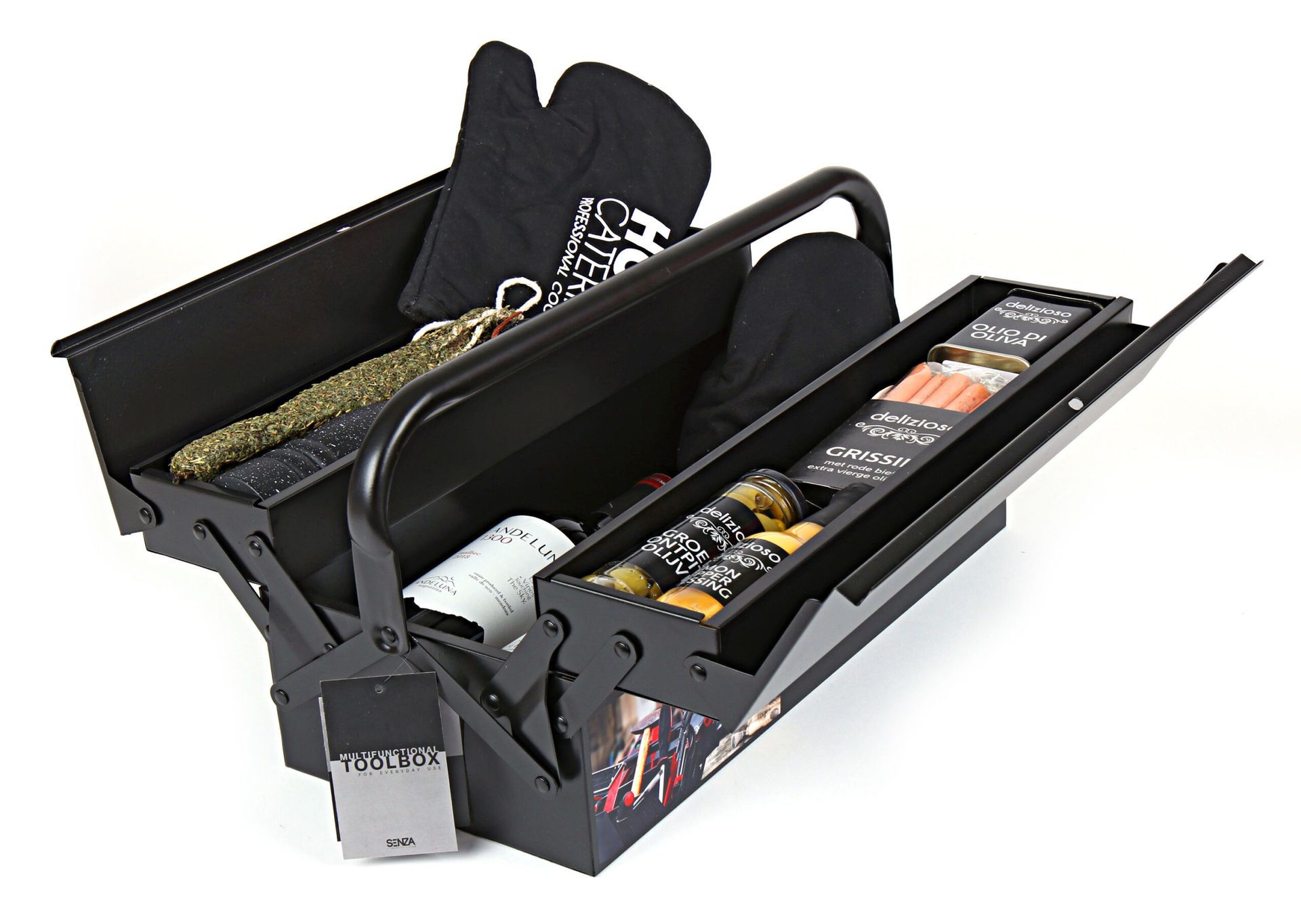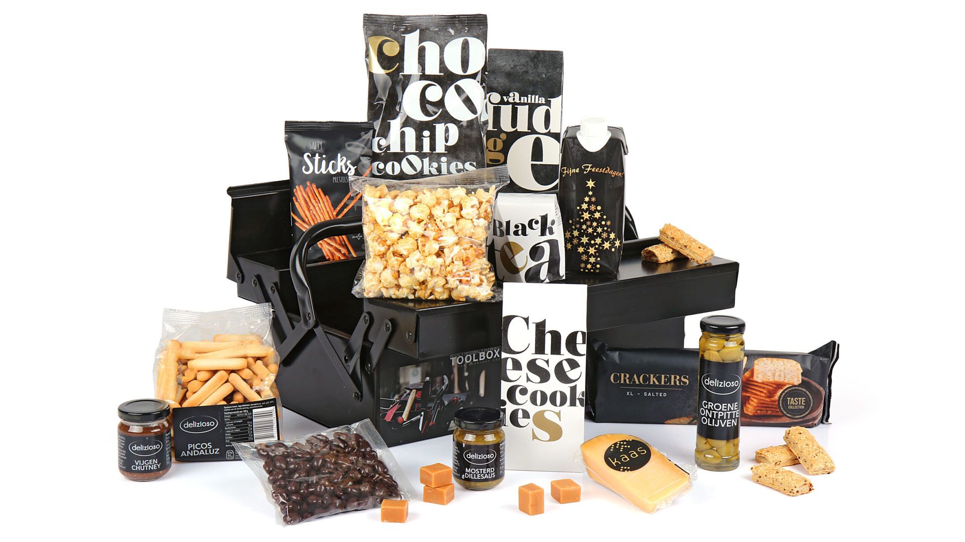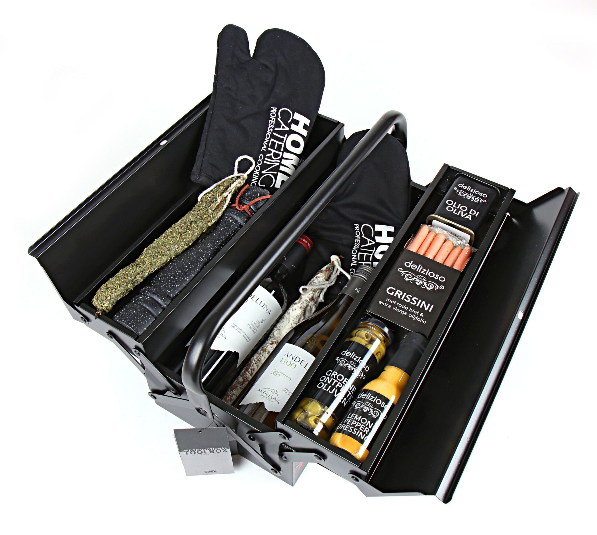 Deze gereedschapskist vol lekkers combineert praktisch nut met culinair genot. De hoogwaardige zwarte Senza gereedschapskist vormt de perfecte basis voor een uniek geschenk dat lang na de feestdagen nog steeds waardevol blijft. Gevuld met zorgvuldig geselecteerde delicatessen biedt dit pakket een complete smaakervaring voor elke gelegenheid.
