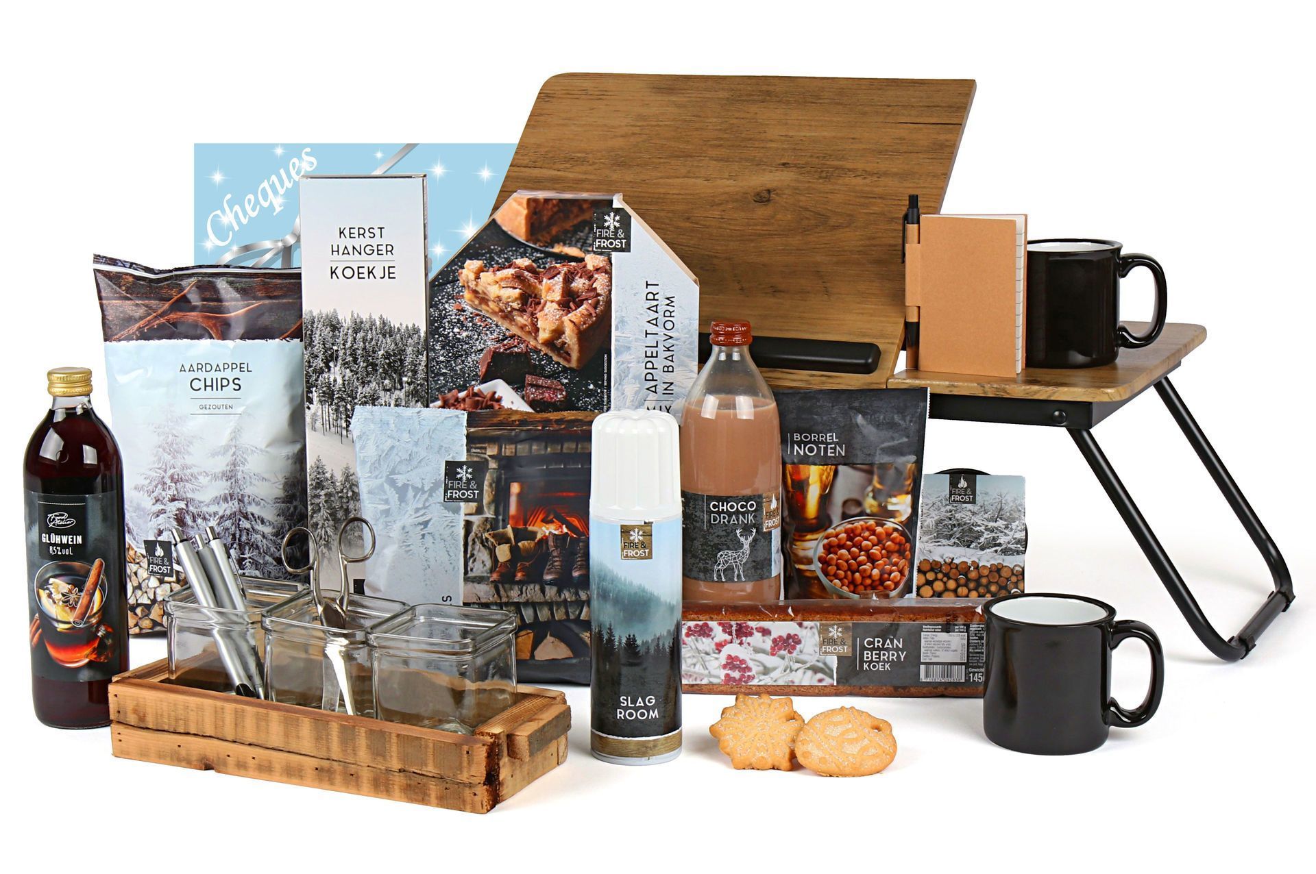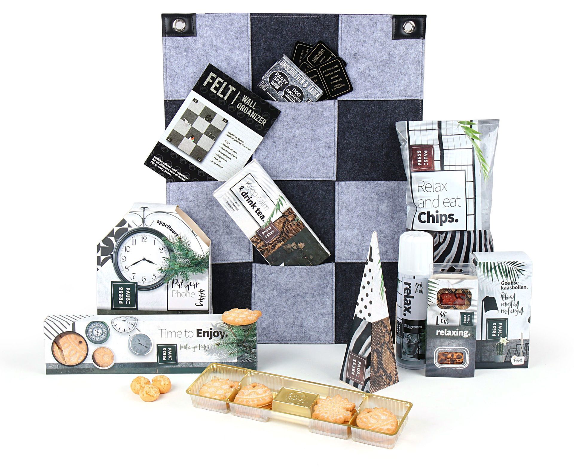 Na het organiseren is het tijd voor pure verwennerij. De Press Pause thee selectie met drie smaken biedt de perfecte pauze tussen het opruimen. De appeltaartmix in bakvorm zorgt voor huiselijke gezelligheid, terwijl de kersthanger koekjes en cream fudge extra verwennen. De verse slagroom maakt elke traktatie compleet.