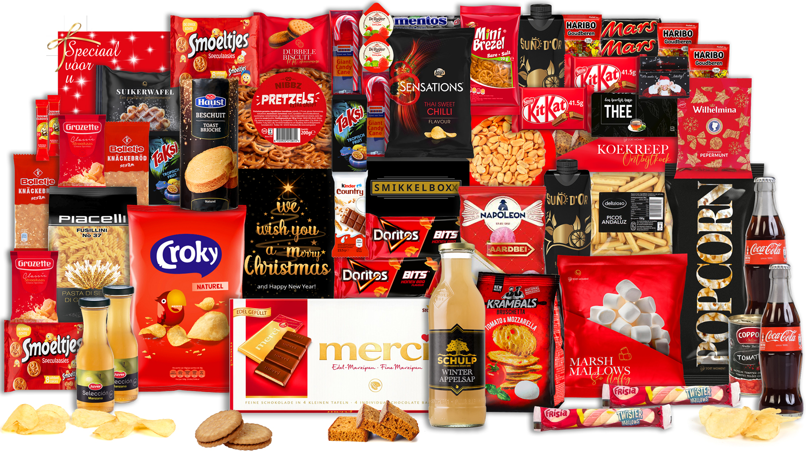 De zoete verwennerij komt tot leven door Haribo goudberen, Mars repen en KitKat, gecombineerd met feestelijke candy canes en luxueuze Merci marsepein. Voor de hartige trek biedt het pakket Croky chips, Lay’s Sensations en knapperige pretzels, perfect voor gezellige avonden.