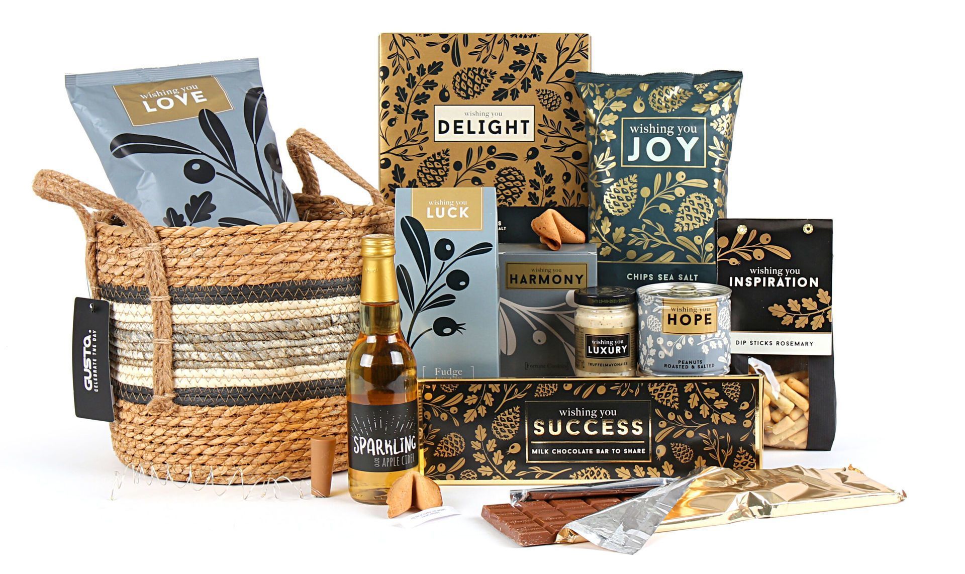 Dankzij onze 30+ jaar ervaring en eigen inpakcentrale wordt elk pakket met zorg samengesteld. Je kunt deze mand bestellen vanaf 1 stuk of naar eigen wensen samenstellen. De feestelijke geschenkdoos maakt de eerste indruk onvergetelijk en benadrukt de gedachte achter elk geschenk: wishing you luck, hope en succes.
