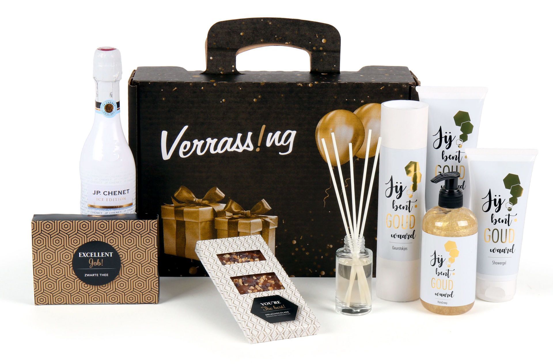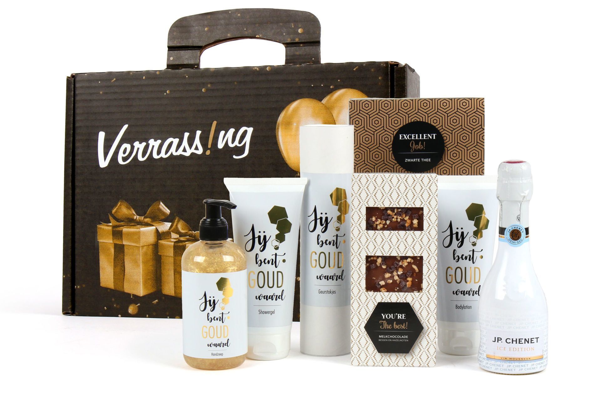 De Gouden verrassing! is een exclusieve verrassingskoffer die laat zien hoeveel je medewerkers of relaties waard zijn. Deze feestelijke koffer combineert luxe verzorgingsproducten met culinaire verwennerij voor een onvergetelijke ervaring. Perfect als kerstcadeau of bedankje voor bijzondere momenten.