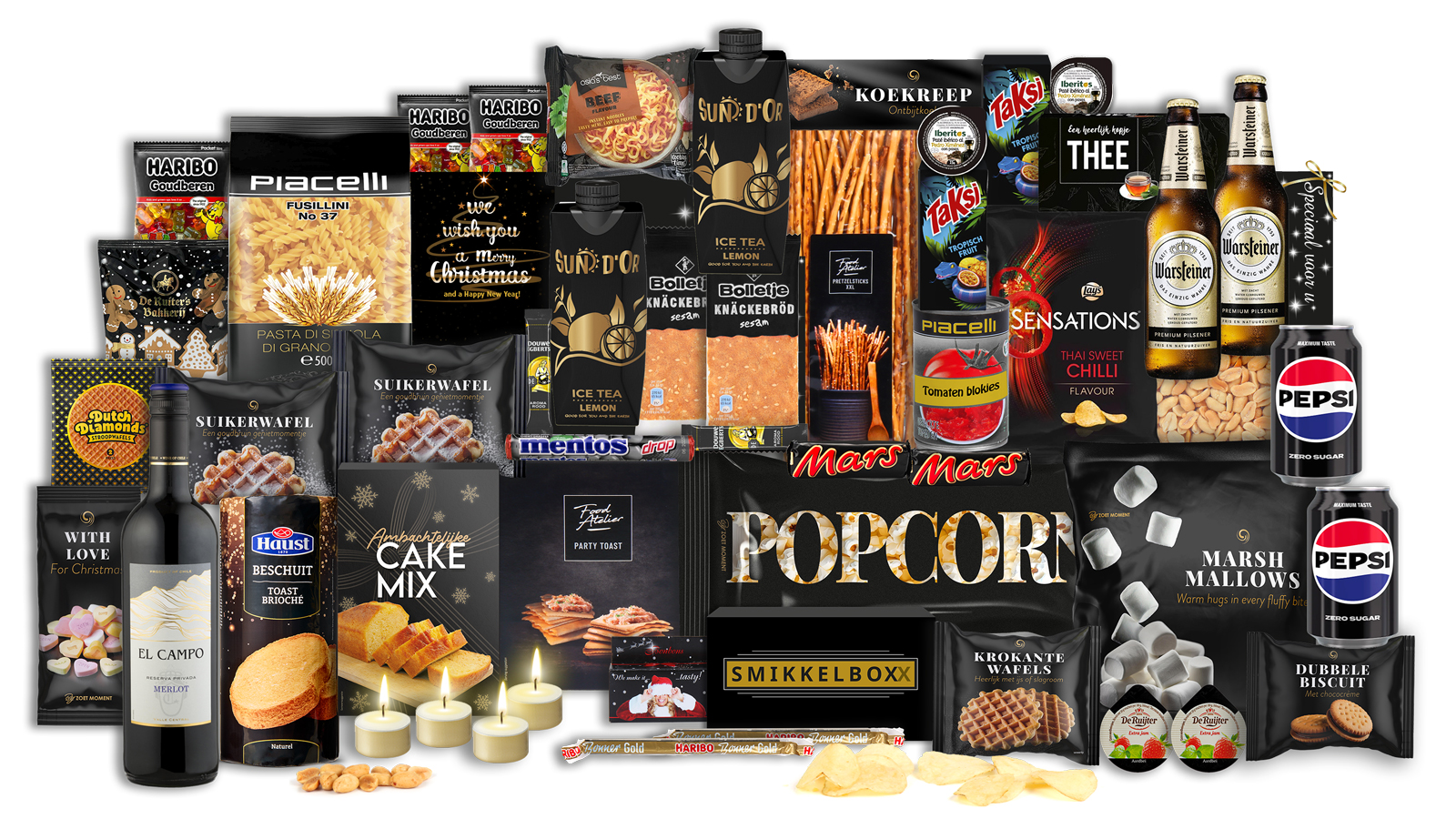 Dit pakket combineert het beste van twee werelden. De El Campo Merlot rode wijn vormt samen met Warsteiner bieren de perfecte basis voor gezellige momenten. Voor de zoetliefhebbers zorgen bonbons, Mars repen en Haribo goudberen voor pure verwennerij. De ambachtelijke cakemix en Dutch Diamonds stroopwafels brengen huiselijke gezelligheid in huis.