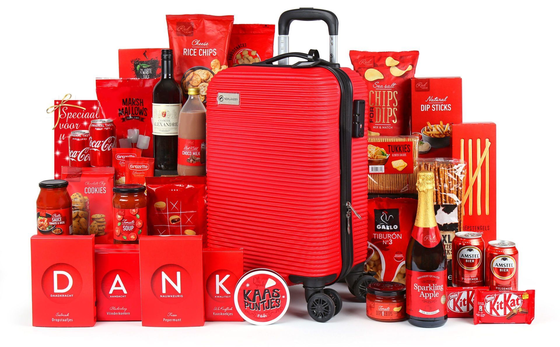 Het Grootse DANK kerstpakket combineert praktisch gemak met culinair genot. Dit uitgebreide pakket bevat een hoogwaardige Nörlander hardcase trolley met TSA-slot, perfect voor reizen, samen met een zorgvuldig samengestelde selectie lekkernijen en drankjes. Een compleet geschenk dat indruk maakt.