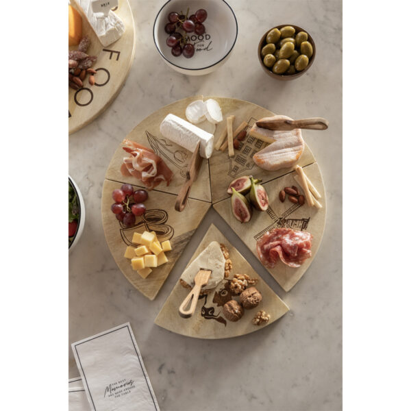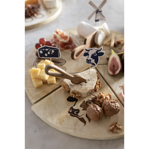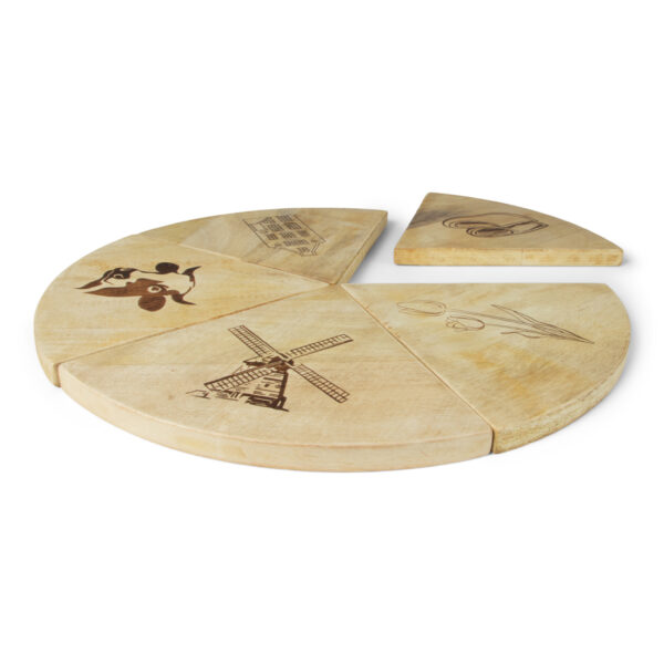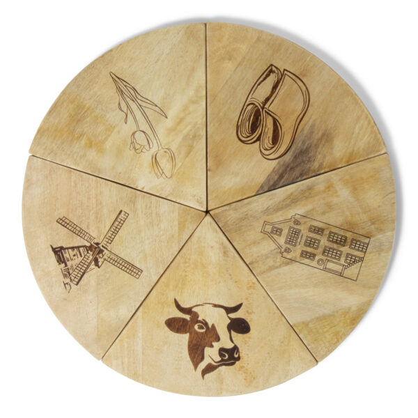 Het hart van dit pakket vormt de bijzondere Senza Dutch Delight serveerplank van 40×40 centimeter. Deze houten plank bestaat uit zes delen die als pizzapunten in elkaar passen. Elke punt toont een typische Nederlandse afbeelding. De plank functioneert zowel als presentatiebord tijdens het serveren als decoratief aandenken na gebruik. De meegeleverde cocktailprikkers completeren de presentatie perfect.