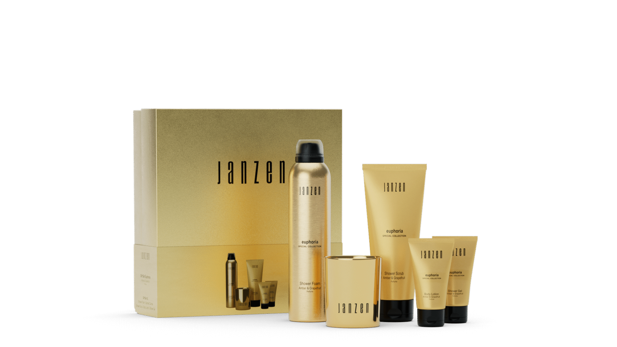 Inhoud van dit pakket Janzen Euphoria Shower foam, 200 ml Janzen Euphoria Shower scrub, 200 ml Janzen Euphoria Scented candle, 120 gr Janzen Euphoria Hand wash, 40 ml Janzen Euphoria Body lotion, 40 ml Verpakt in feestelijke Janzen giftbox