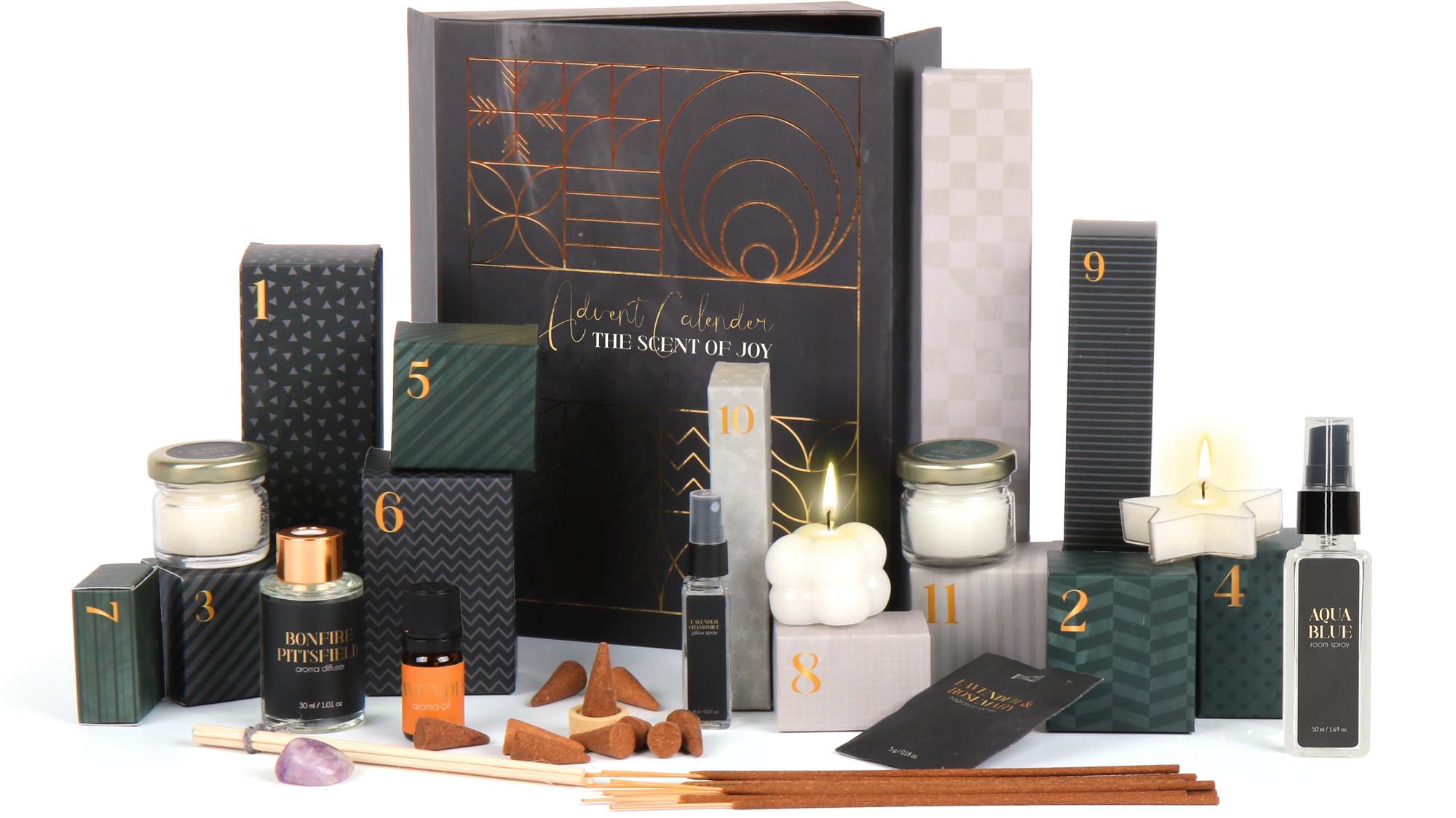 Elke dag opent een nieuw vakje met unieke geurproducten. De Fresh Breeze aroma diffuser van 30ml creëert direct een frisse sfeer in je huis, terwijl de eucalyptus aroma olie van 5ml perfect aanvult voor een verkwikkende geurervaring. De Green Tea geurkaars en Calming Nights kaars van elk 25 gram bieden verschillende stemmingen voor overdag en ’s avonds. De bubble candle van 40 gram en star tea light van 15 gram voegen speelse elementen toe aan je interieur.