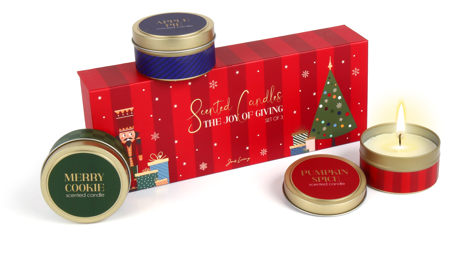 Het Jens Living Scent of Joy kaarsen kerst kerstpakket brengt de warmte van de feestdagen direct in huis. Dit zorgvuldig samengestelde pakket bevat drie unieke kaarsen die elk een eigen kerstgevoel oproepen. De Pumpkin Spice kaars vult je ruimte met de kruidige warmte van kaneel en nootmuskaat, terwijl de Apple Pie kaars de zoete geur van verse appeltaart verspreidt. De Merry Cookie kaars completeert het geheel met de vertrouwde geur van vers gebakken koekjes.