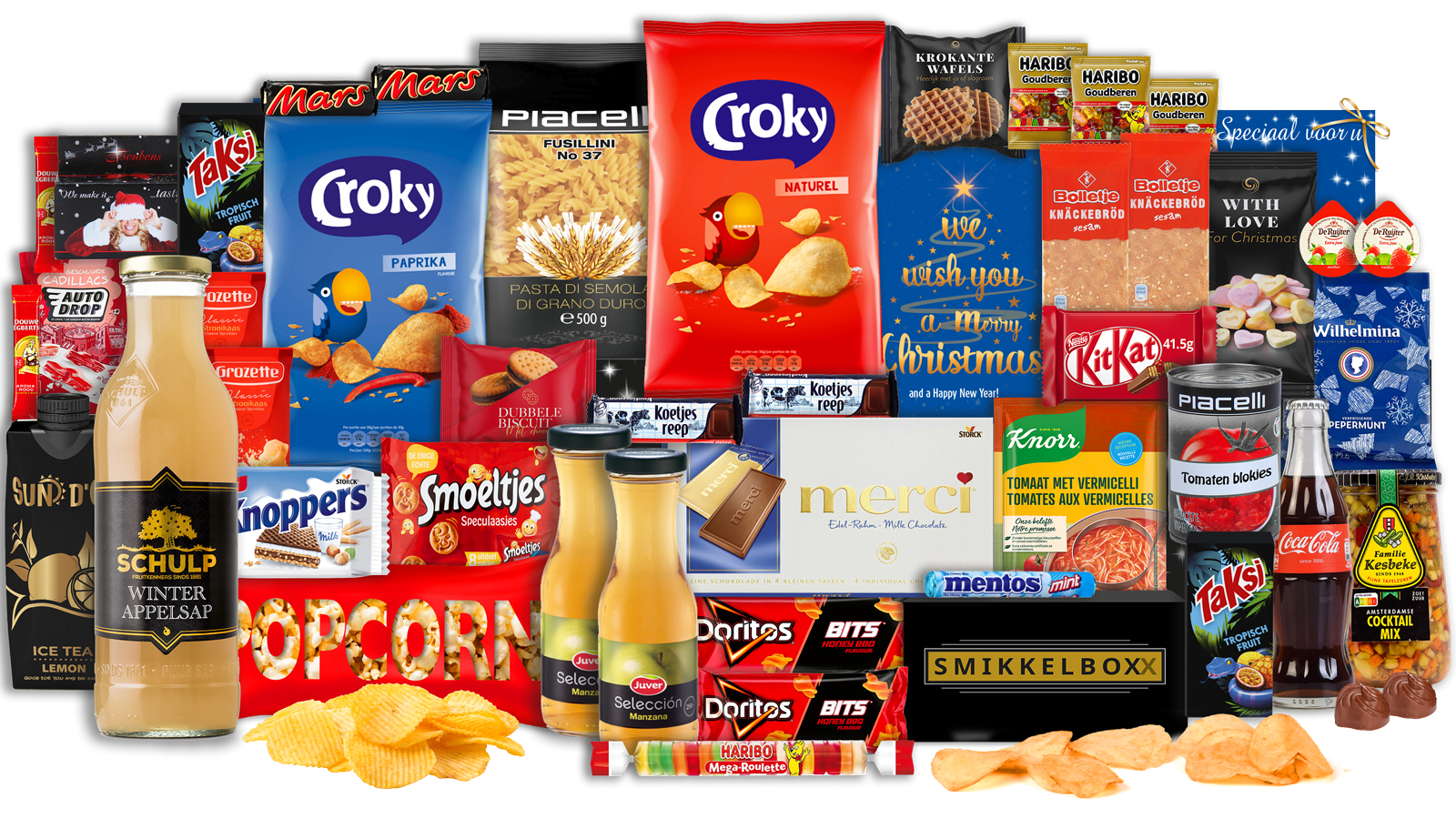 Het hart van dit pakket wordt gevormd door herkenbare A-merken zoals Douwe Egberts oploskoffie voor de dagelijkse pauze, Croky chips in paprika en naturel voor de hartige trek, en Merci Edel-rahm chocolade als luxe verwennerij. De Kesbeke cocktailmix zorgt voor een feestelijke touch bij de borrel, terwijl Mars, KitKat en Koetjesrepen de zoete momenten verzorgen. Voor de complete maaltijd vind je Knorr tomatensoep, pasta fusillini en gehakte tomaten terug.