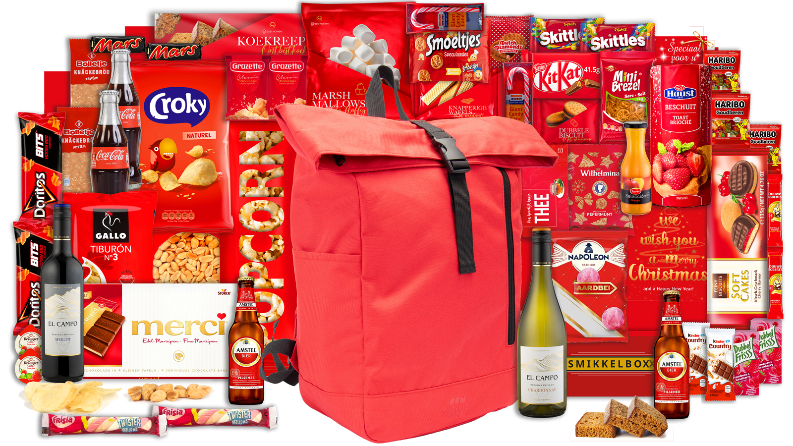 Dit pakket brengt diversiteit aan smaken samen. De El Campo Merlot en Chardonnay wijnen zorgen voor verfijnde momenten, terwijl de Amstel biertjes en frisse drankjes zoals Coca-Cola en Dubbelfrisss perfect zijn voor ontspanning. Haribo goudberen, Mars repen en Skittles geven een zoete touch, aangevuld met hartige keuzes zoals Croky chips, Doritos Bits en knapperige pinda’s.