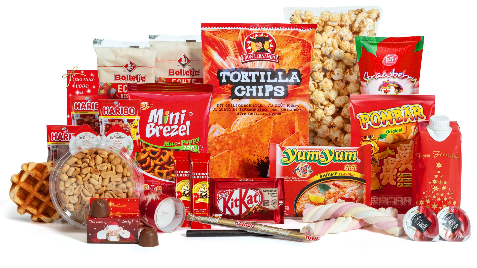 Van zoet tot hartig, dit pakket laat niemand op zijn honger zitten. Krokante gezouten pinda’s, pittige maistortillachips met chilismaak en klassieke Pombar chips zorgen voor de hartige momenten. De zoeteliefdebbers komen aan hun trekken met KitKat, Haribo snoep, verse bonbons en een heerlijke suikerwafel.