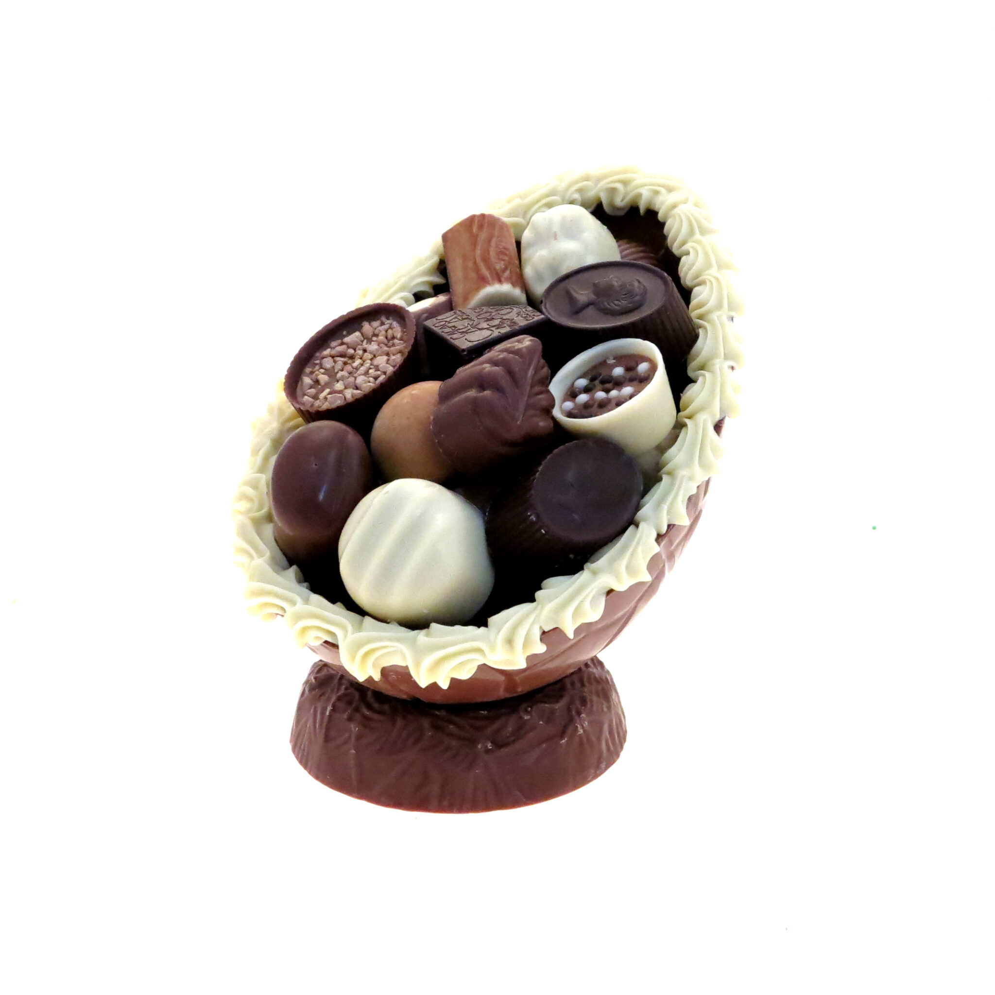 • Luxe paasei, gevuld met bonbons in een chocolade nest met witte rand, 500 gr