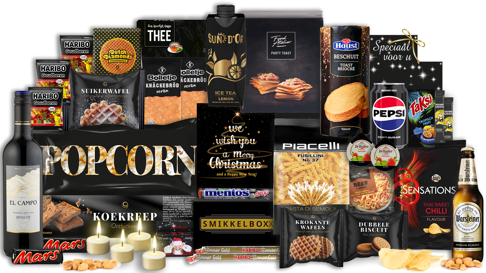 Het hart van dit pakket wordt gevormd door de hoogwaardige El Campo Merlot rode wijn van 75cl, perfect voor de feestelijke momenten. Daarnaast vind je een verfrissend Warsteiner bier en verschillende drankjes zoals Pepsi Max, Taksi tropisch fruit en ice tea voor elke smaakvoorkeur. De combinatie van zoete lekkernijen zoals Haribo goudberen, Mars repen en bonbons zorgt voor die welverdiende verwenmomentjes.