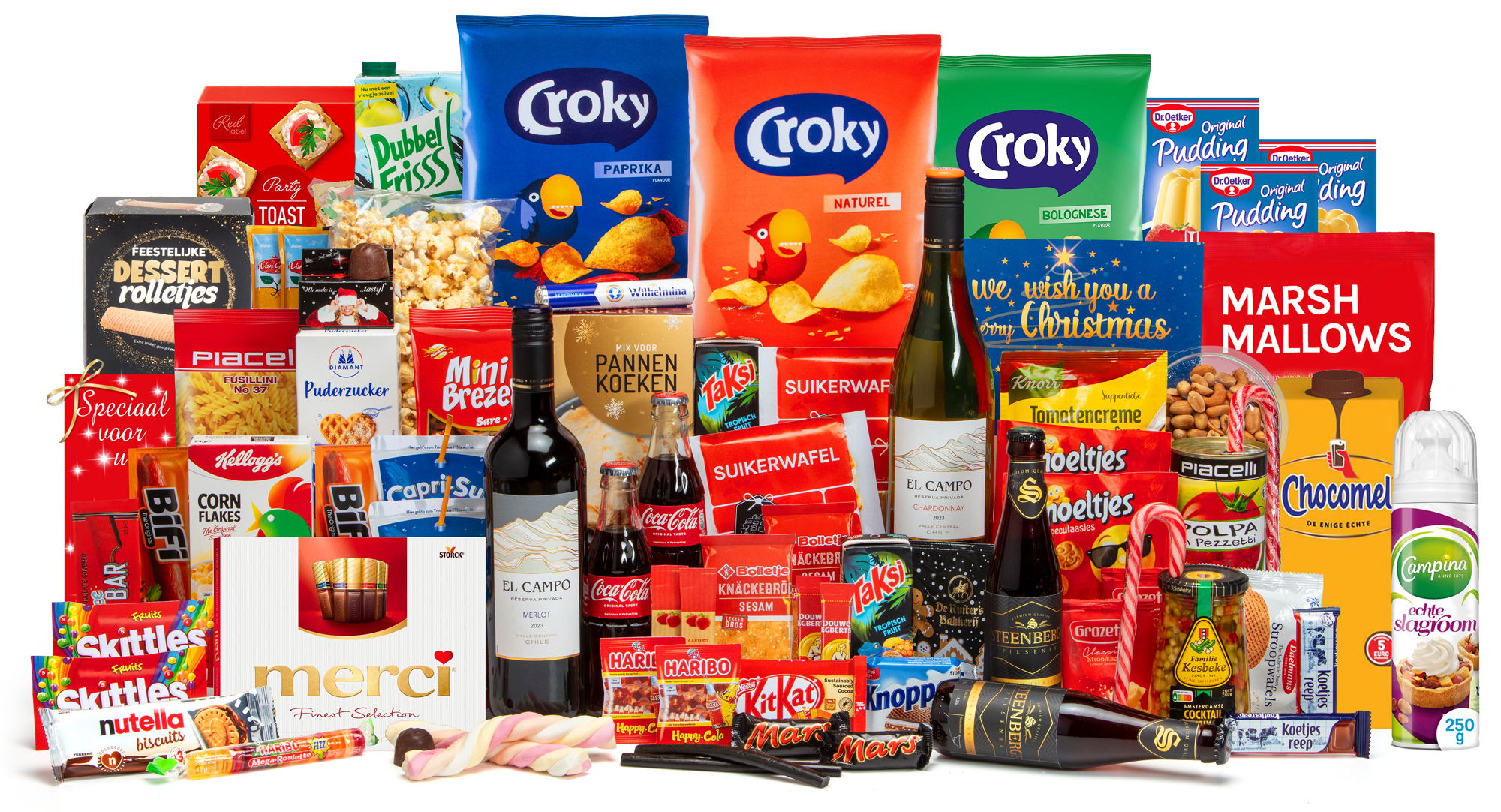 Begin je dag met Kellogg’s cornflakes en verse Chocomel, geniet tussendoor van Mars Zwart Goud, KitKat en de klassieke Koetjesreep. Voor de lunch vind je Bolletje knäckebröd met abrikozenjam, terwijl het diner compleet wordt met pasta fusillini, tomatenblokjes en strooikaas. Kesbeke cocktailmix en Campina slagroom maken elk moment feestelijk. Croky chips in drie verschillende smaken zorgen voor de perfecte snack bij gezellige avonden.