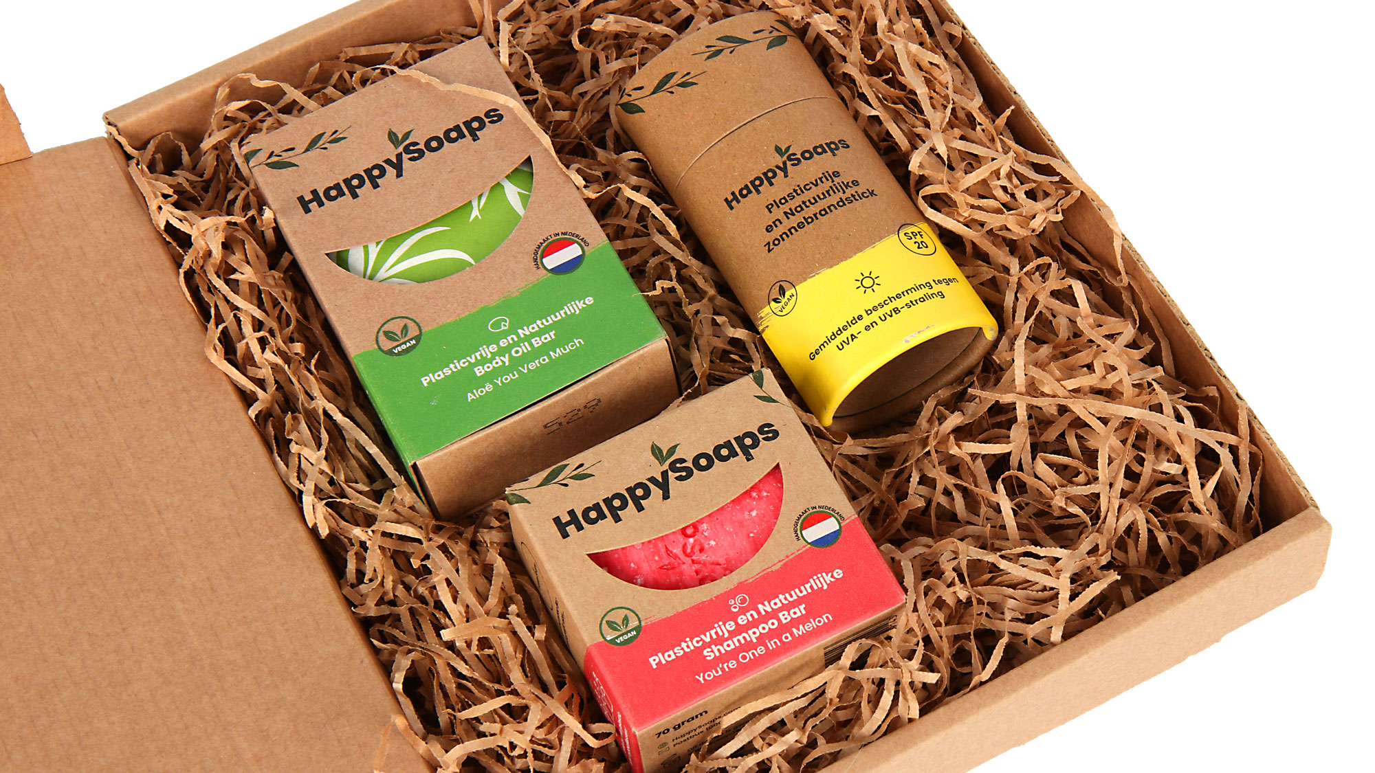 Happy Soaps staat bekend om hun toewijding aan natuurlijke ingrediënten zonder schadelijke stoffen. Deze bars bevatten geen palmolie, SLS, SLES of microplastics. Elk product is 100% vegan en handgemaakt in Nederland. Dit maakt het pakket niet alleen goed voor jou, maar ook voor de planeet.