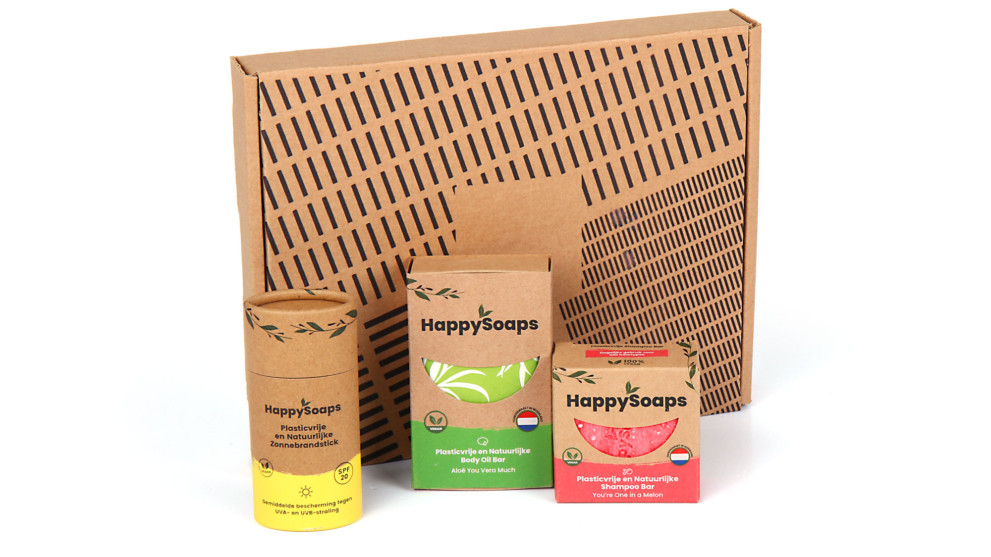 Het Happy Soaps zomerpakket bevat alles wat je nodig hebt voor een stralende zomer. De zonnebrandstick SPF 20 in de frisse ‘Soothing Citrus’ geur beschermt je huid met natuurlijke ingrediënten, terwijl de verfrissende citrusgeur je meteen in zomerstemming brengt. De body wash bar ‘Aloë You Vera Much’ zorgt voor zachte, gehydrateerde huid na een dag in de zon, dankzij de verzorgende eigenschappen van aloë vera. De shampoo bar ‘You’re One in a Melon’ maakt je haarverzorging compleet met zijn speelse meloenengeur.