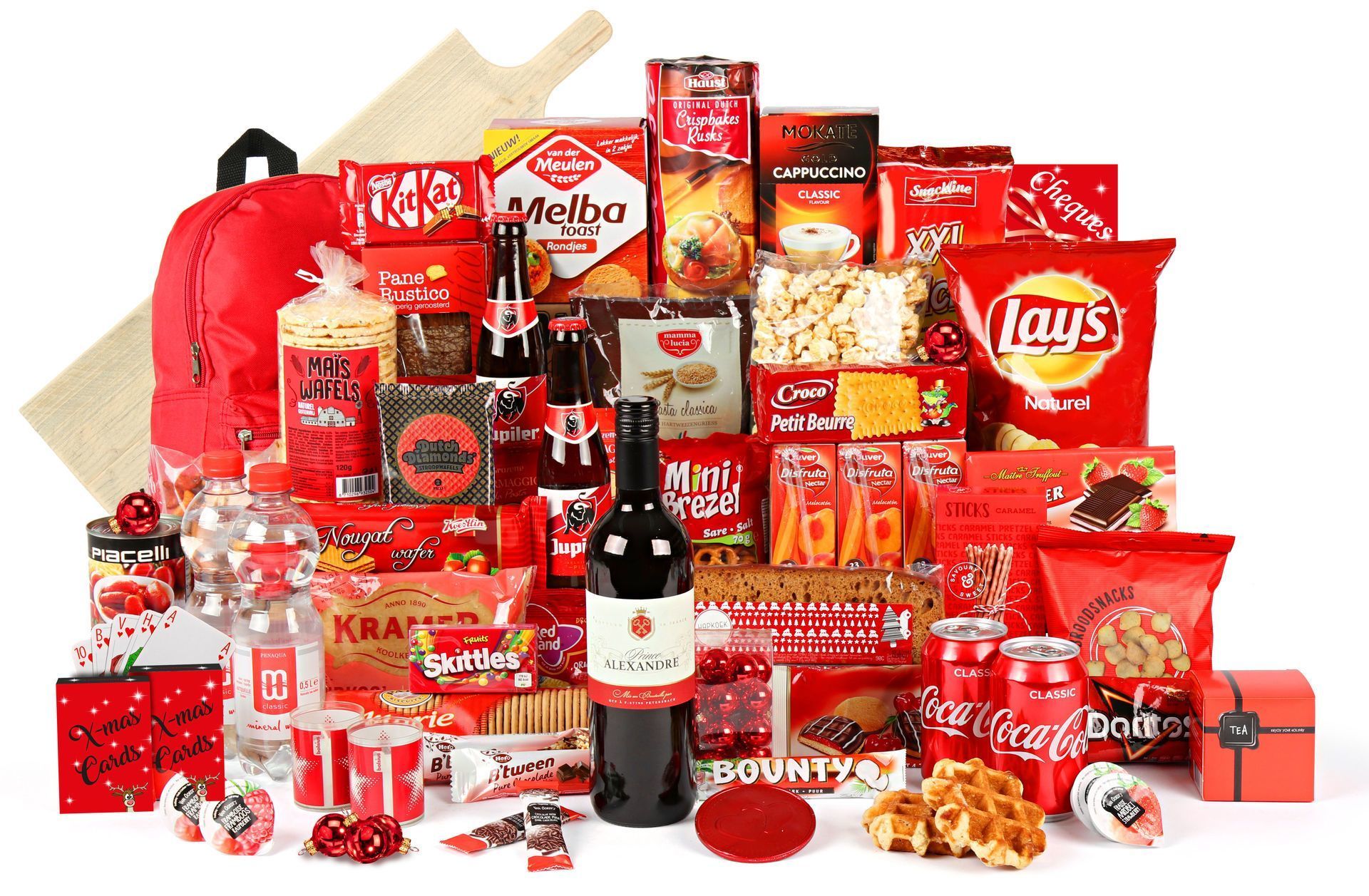 De houten hapjesplank van 70x20x3 cm vormt het hart van dit mooie kerstpakket. Daaromheen vind je een gevarieerde mix van kwaliteitsproducten: van Prince Alexandre rode wijn tot Jupiler bier, van KitKat chocolade tot artisanale stroopwafels. De bijgevoegde sparkle lights en glazen kerstballen zorgen voor extra kerstsfeer. De praktische rugzak maakt het pakket compleet voor uitstapjes.