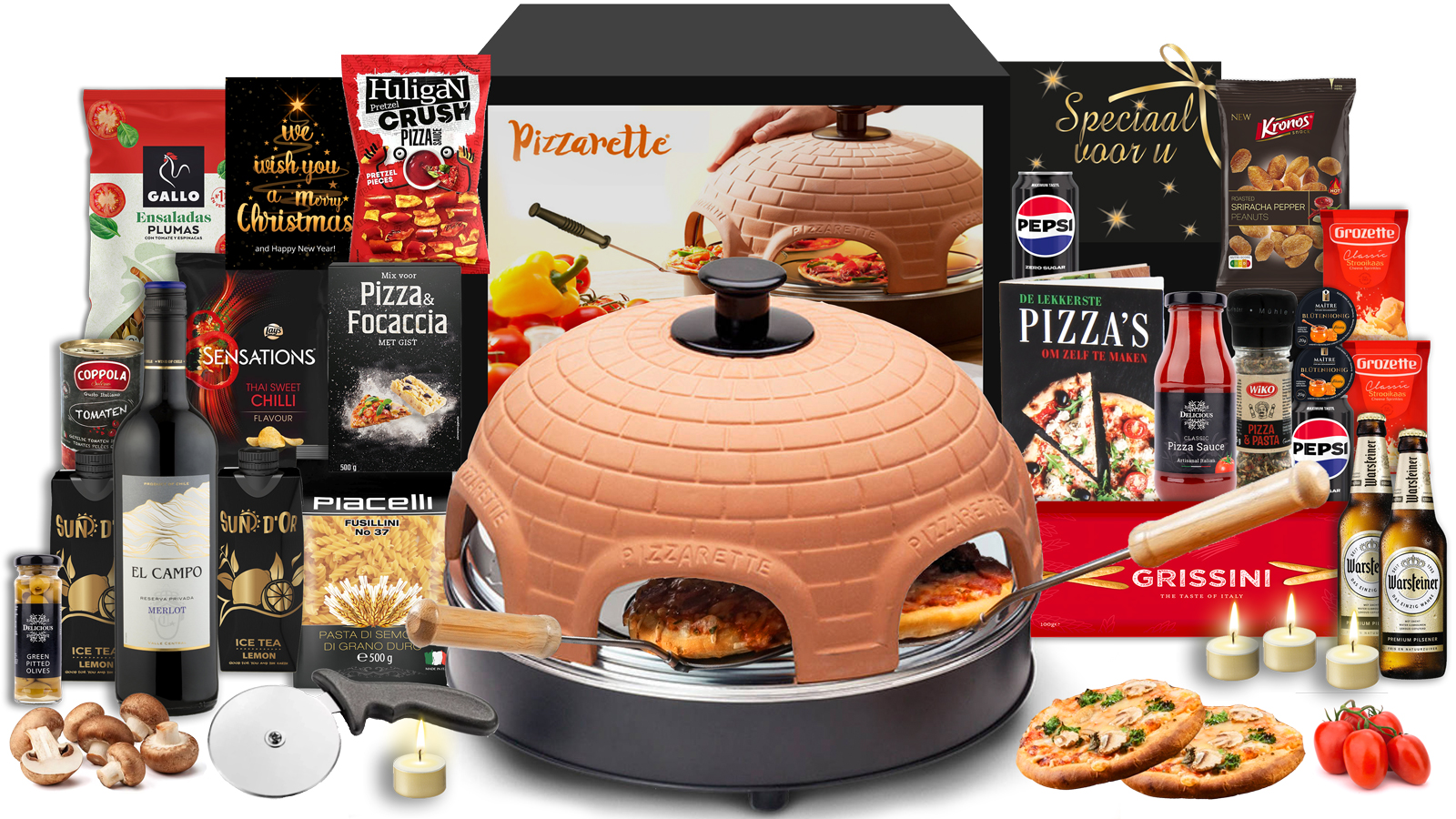 De Pizzarette topper 6 personen brengt de Italiaanse keuken rechtstreeks naar je kersttafel. Dit complete kerstpakket transformeert elke feestelijke avond in een culinair evenement waar familie en vrienden samen van kunnen genieten. Met meer dan 30 jaar ervaring hebben wij dit pakket vakkundig samengesteld en ingepakt in onze eigen inpakcentrale.