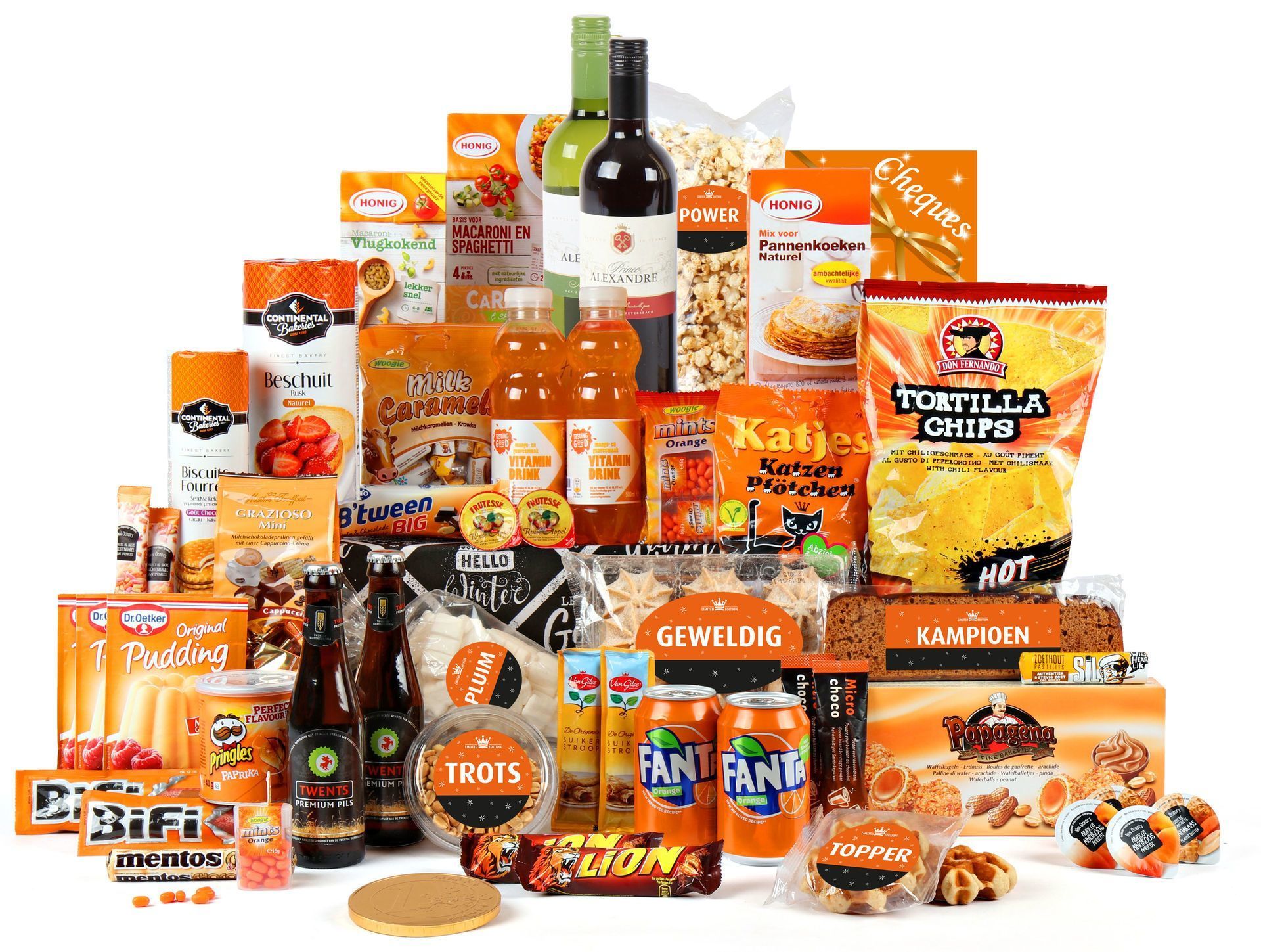 Het Oranje Trots XL pakket vertelt het verhaal van echte Nederlandse gezelligheid. Begin je dag met verse beschuit en vruchtenhagel, begeleid door warme cacao uit onze handige sticks. Voor de lunch creëer je gemakkelijk een maaltijd met de Honig elleboogjes en pastasaus, terwijl de tortilla chips met kaassmaak zorgen voor die perfecte tussendoortje. De Prince Alexandre wijnen – zowel rood als wit – maken elke avond tot een feestelijke gelegenheid, aangevuld met authentiek Twents pils.
