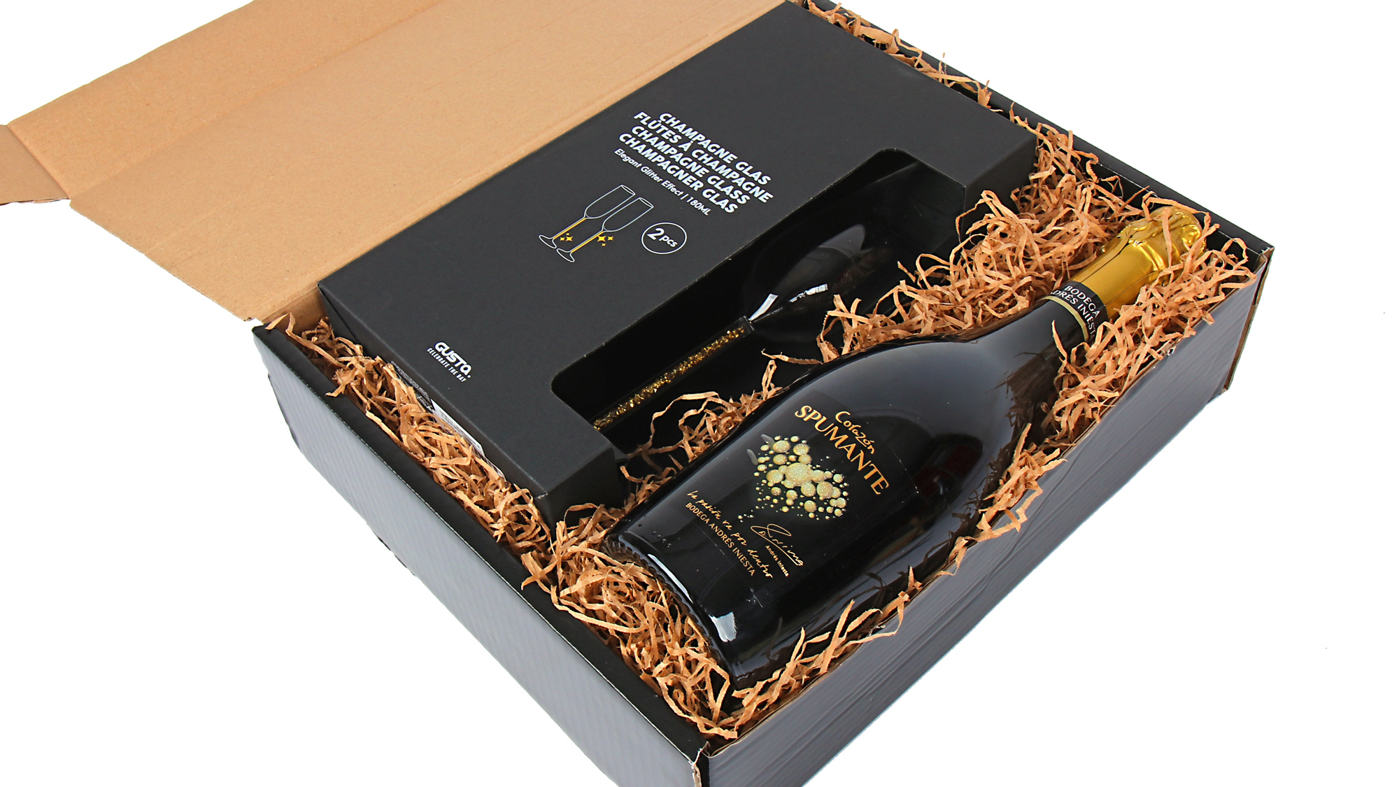 Het hart van dit pakket wordt gevormd door de Iniesta Carazon Spumante mousserende wijn van 75 cl. Deze hoogwaardige bubbels zorgen voor dat speciale gevoel bij elke toast. Daarnaast ontvang je twee luxe champagneglazen met een opvallende glittervoet die extra glamour toevoegt aan elk moment. Het complete pakket wordt feestelijk gepresenteerd in een elegante zwarte geschenkdoos die direct de juiste indruk maakt.