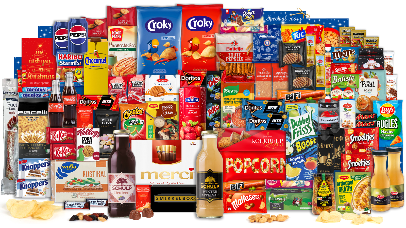 De indrukwekkende variatie aan producten zorgt ervoor dat je geen enkele boodschap meer hoeft te doen. Het pakket bevat zowel zoete verwennerijen zoals Maltesers en Merci chocolade als hartige snacks waaronder Croky chips en Tuc crackers. Voor de warme dranken is gezorgd met Douwe Egberts koffie en Pickwick thee, terwijl de koude verfrissing komt van Coca Cola, Pepsi en verschillende vruchtensappen.