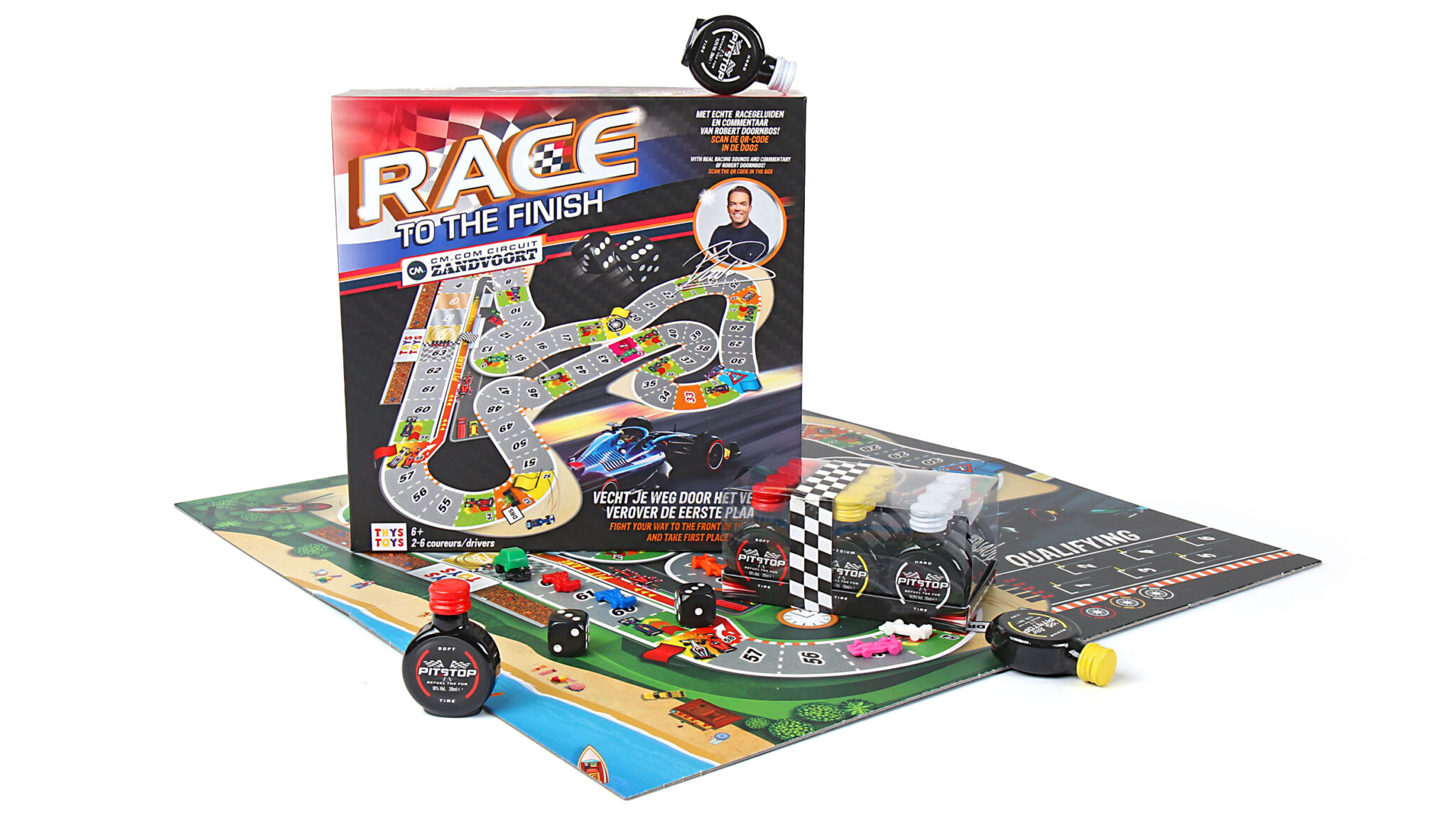 Het pakket bevat niet alleen het bordspel Race to the Finish, maar ook twaalf Pitstop shots van 20 ml elk. Deze populaire shotjes voegen een extra feestelijke dimensie toe aan je speelavond. Alles wordt feestelijk verpakt in een hoogwaardige geschenkdoos, klaar om cadeau te geven.