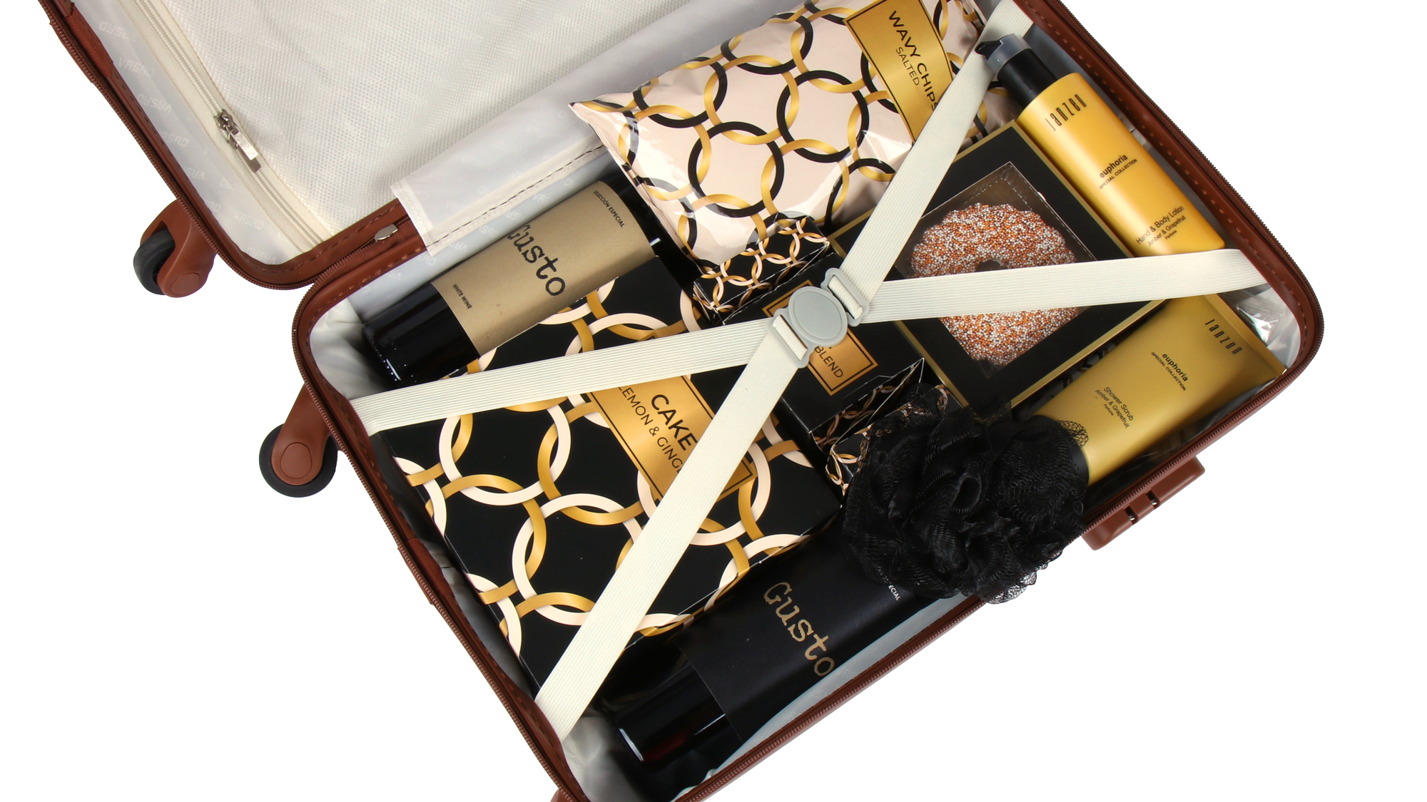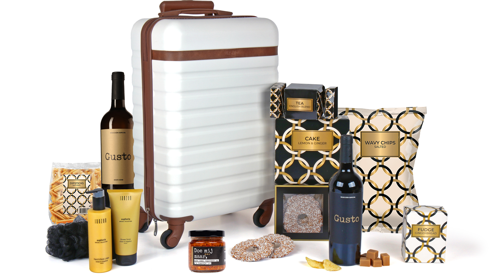 Het kerstpakket ‘Luxe reizen in stijl’ combineert elegantie met pure verwennerij. Deze exclusieve geschenkset draait om de stijlvolle ivoren ABS trolley die bestand is tegen alle weersomstandigheden. De hoogwaardige koffer vormt de basis voor een luxe ervaring die lang na de feestdagen blijft geven.