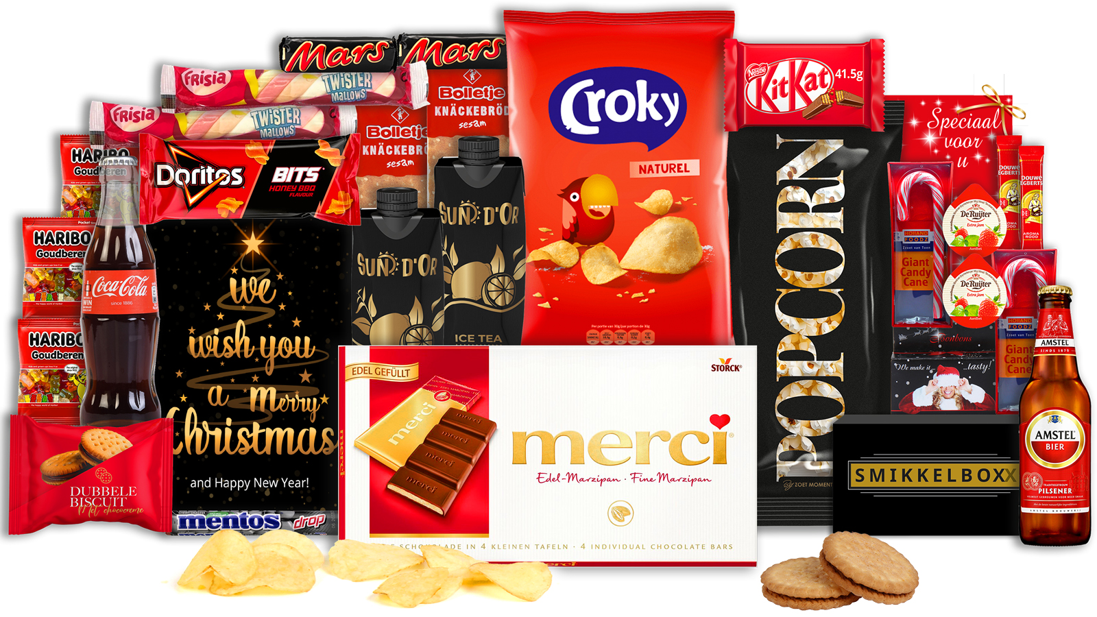 In de feestelijke kerstdoos vind je een Amstel bier van 30 cl en een verfrissende Coca Cola van 20 cl, perfect voor de gezellige momenten. Voor de zoetekauwen is er Merci marsepein van 112 gram, twee Mars repen, een KitKat van 41,5 gram en drie zakjes Haribo goudberen. De hartige trek stil je met knapperige Croky naturel chips van 100 gram, verse popcorn en Doritos Bits honey bbq.