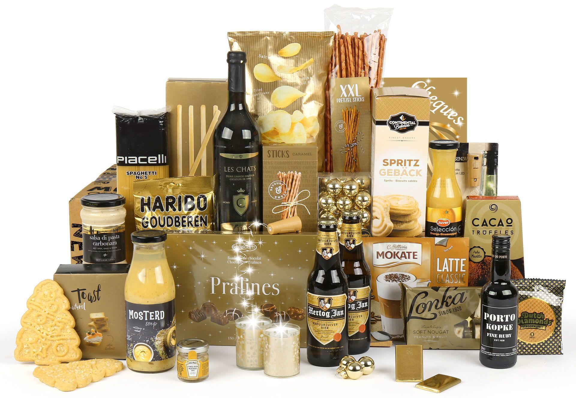 De culinaire reis begint met premium chocolade en pralines, aangevuld met Nederlandse specialiteiten zoals Dutch Diamonds stroopwafels en Lonka soft nougat. Voor de hartige momenten zorgen kwaliteitsproducten als Hertog Jan bieren, Les Chats wijn en Kopke port ruby. De complete maaltijdervaring wordt afgerond met Italiaanse pasta, carbonara saus en een verfijnde mosterdsoep van Bicro.