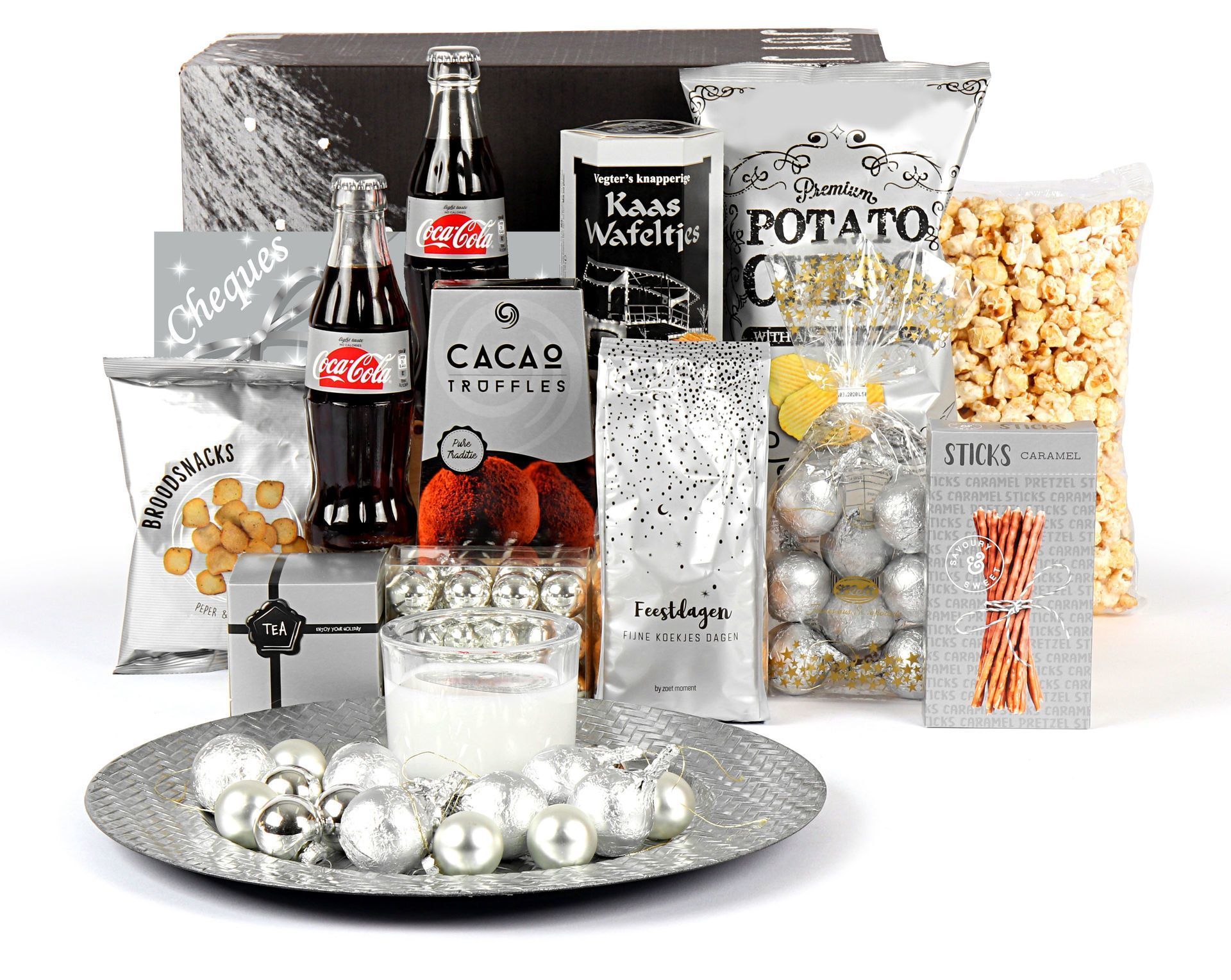 De elegante zilverkleurige schaal (33x33xh2cm) vormt het hart van dit pakket en presenteert een gevarieerde selectie lekkernijen. Van premium chocolade truffels en decoratieve boomhangers tot hartige kaaswafeltjes en chips touch of salt. De fairtrade thee zorgt voor warme momenten, terwijl de Coca Cola Light flesjes verfrissing bieden. Het sterretjeskoek, de zoete popcorn en caramel sticks maken het smaakpalet compleet.