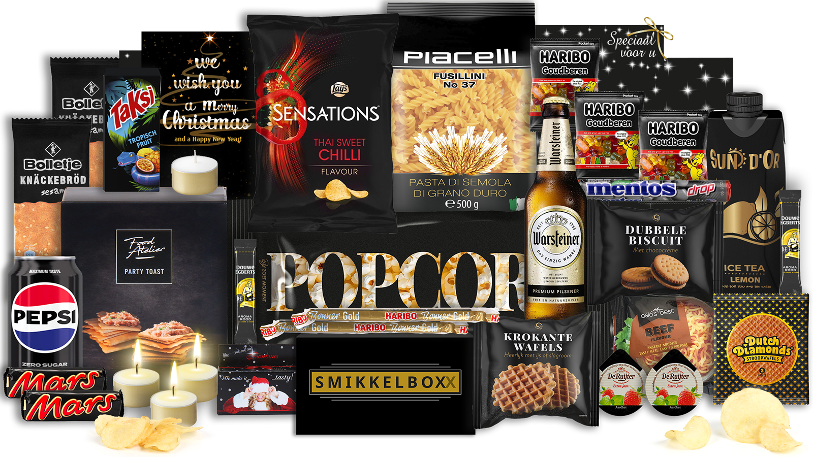 Van Dutch Diamonds stroopwafels tot Haribo goudberen en bonbons – dit pakket laat niemand ontevreden. De hartige kant wordt vertegenwoordigd door Lay’s Sensations thai sweet chilli chips, knäckebröd van Bolletje en voedzame beef noodles. Een galetten wafel en dubbele biscuit maken de selectie compleet.