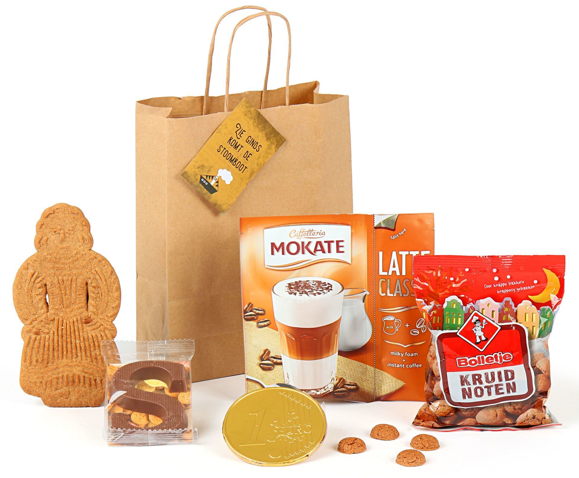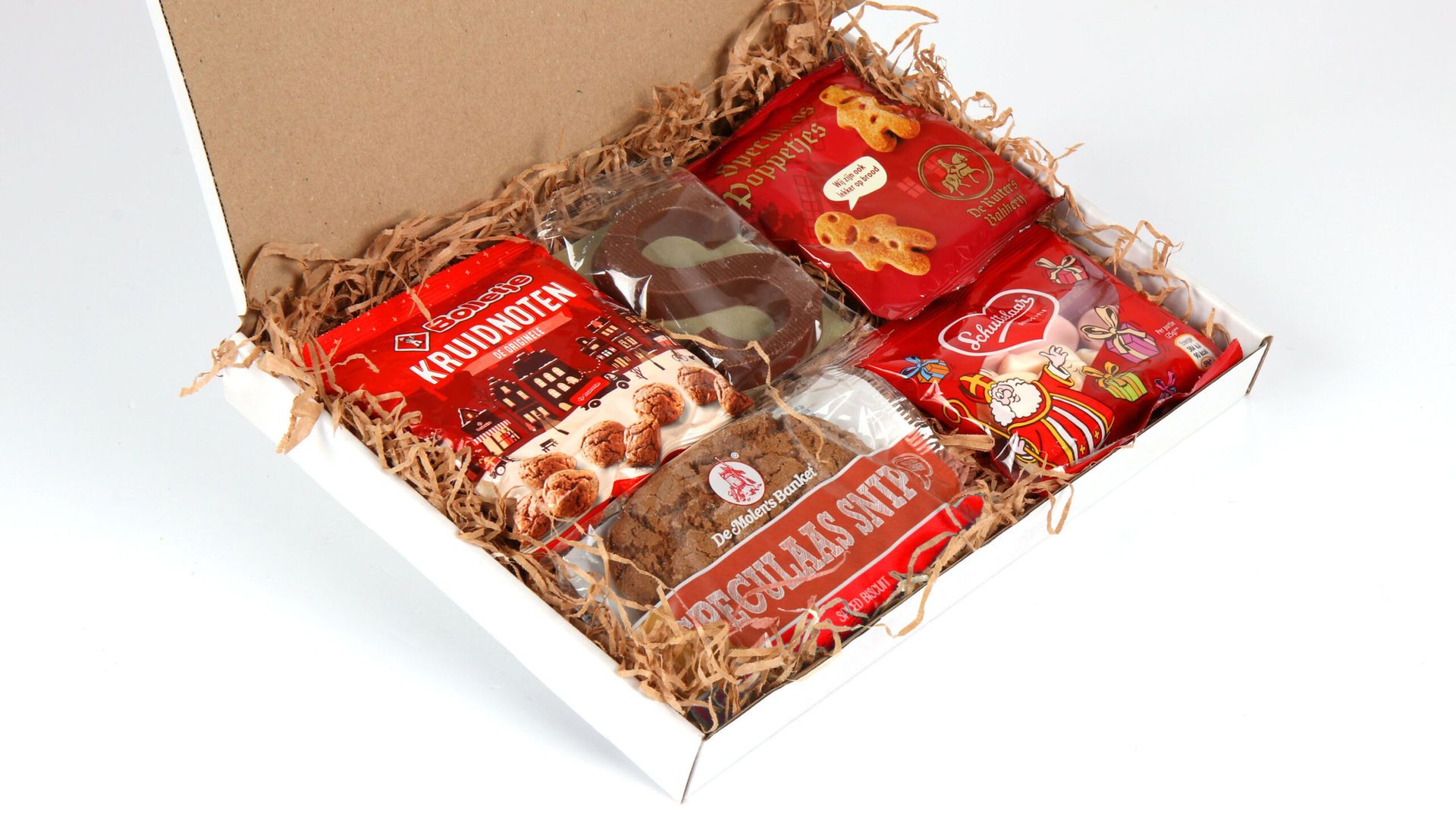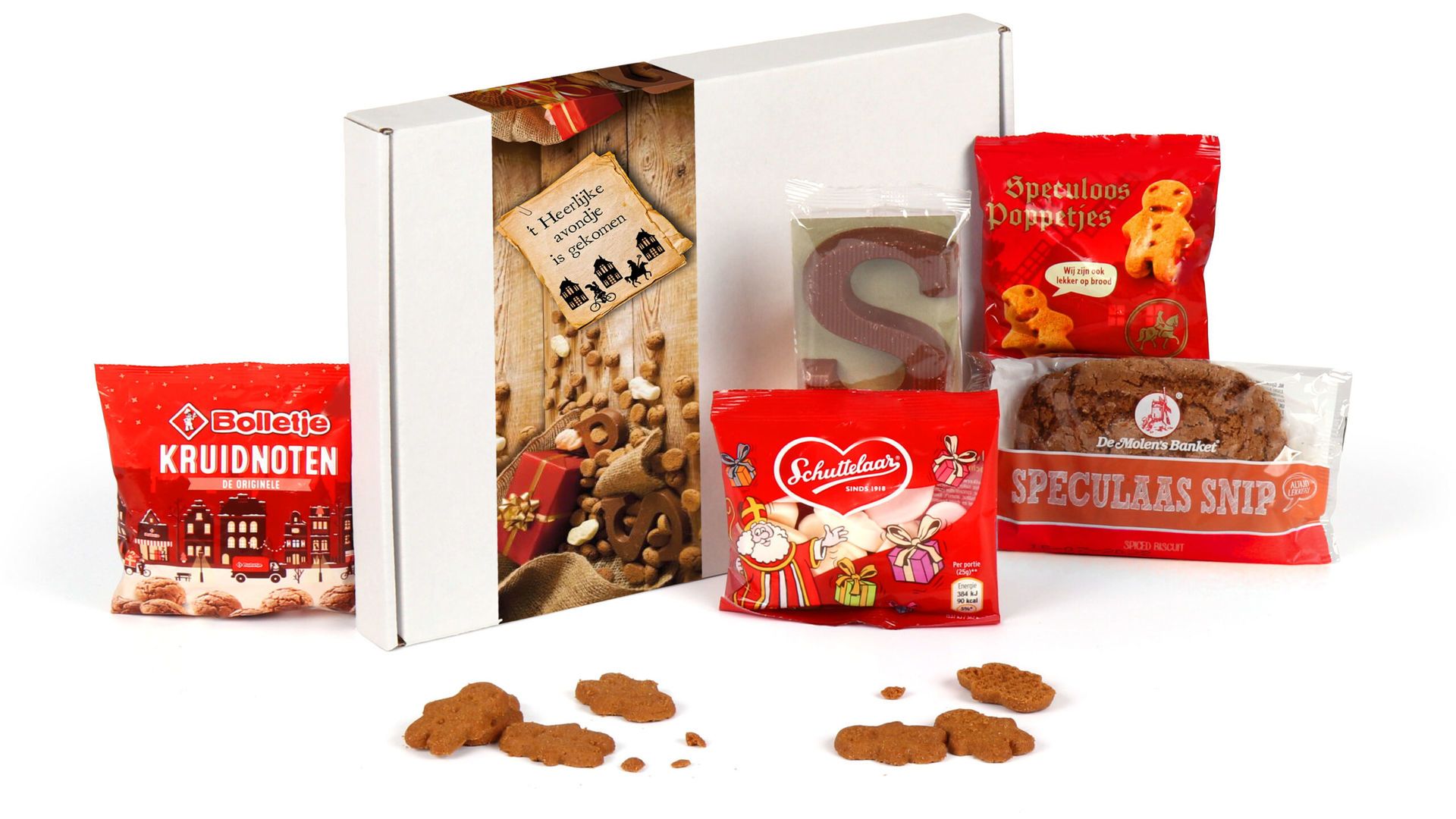 Het pakket bevat een zorgvuldig samengestelde selectie Sinterklaasklassiekers. De melkchocolade schoenletter “S” van 40 gram vormt het hart van de verrassing, aangevuld met 50 gram knapperige kruidnoten van Bolletje. De Molen speculaas snips van 48 gram en 25 gram speculaaspoppetjes van De Ruiter zorgen voor die authentieke speculaassmaak. Het zachte Sint schuim van Schuttelaar van 50 gram maakt de selectie compleet.