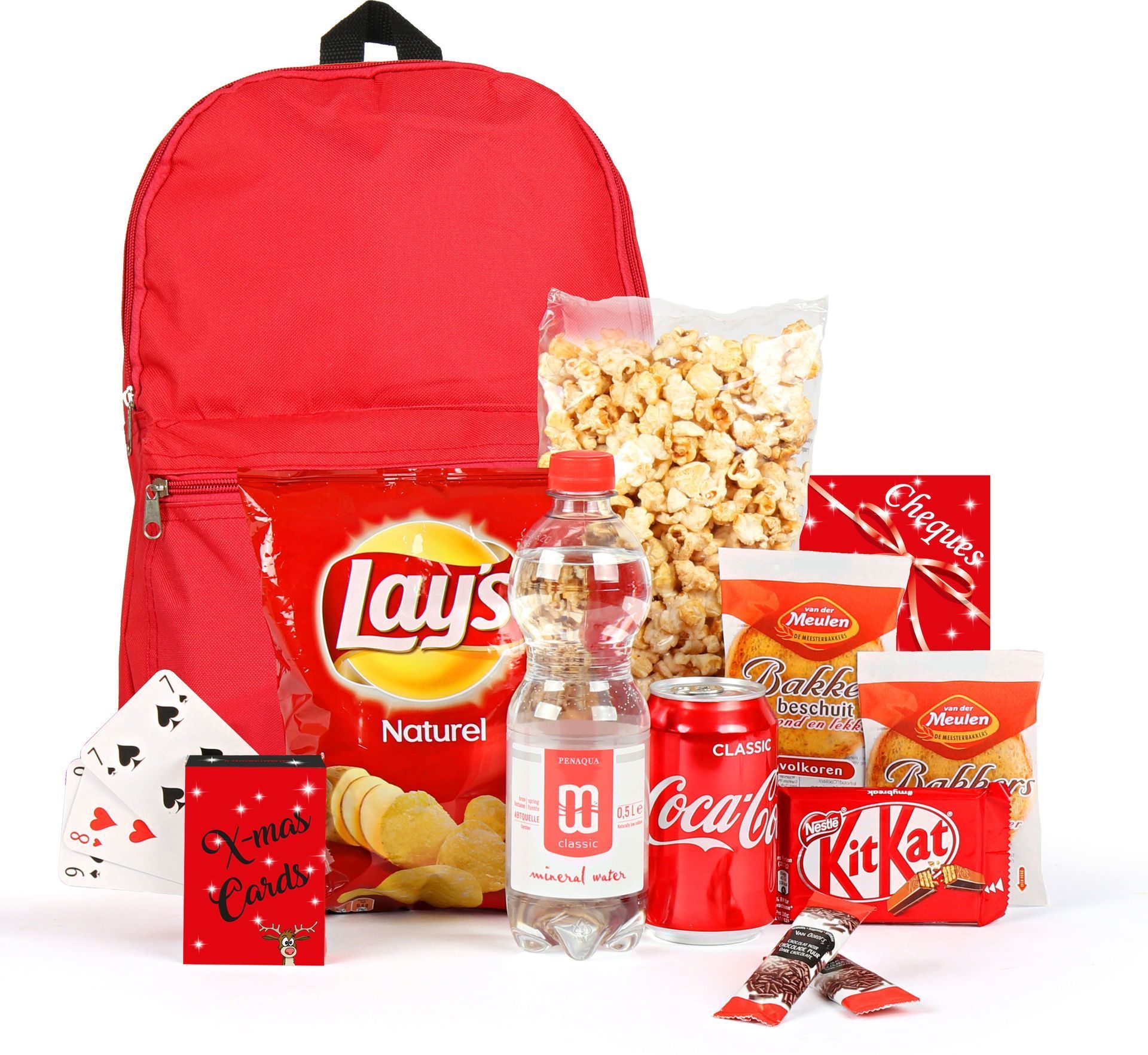 De sportieve kleintje rugzak in opvallend rood combineert praktisch gemak met een complete verzameling snacks, drankjes en unieke vakantiebonnen. Deze compacte rugtas van 30×10.5×39,5 cm zit vol met zorgvuldig geselecteerde producten die perfect zijn voor onderweg of als verrassing voor sportievelingen.