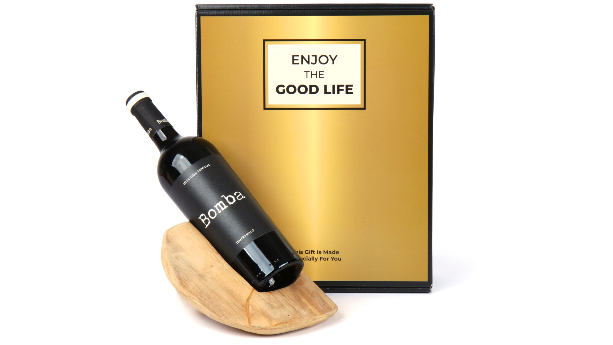 De massief houten standaard heeft een dubbele functie. Hij presenteert je wijn stijlvol en blijft na het legen van de fles een praktisch accessoire voor de keuken. De Bomba Tempranillo staat bekend om zijn volle smaak en uitstekende prijs-kwaliteitverhouding. Het pakket is direct geschikt voor overhandiging dankzij de luxe verpakking.