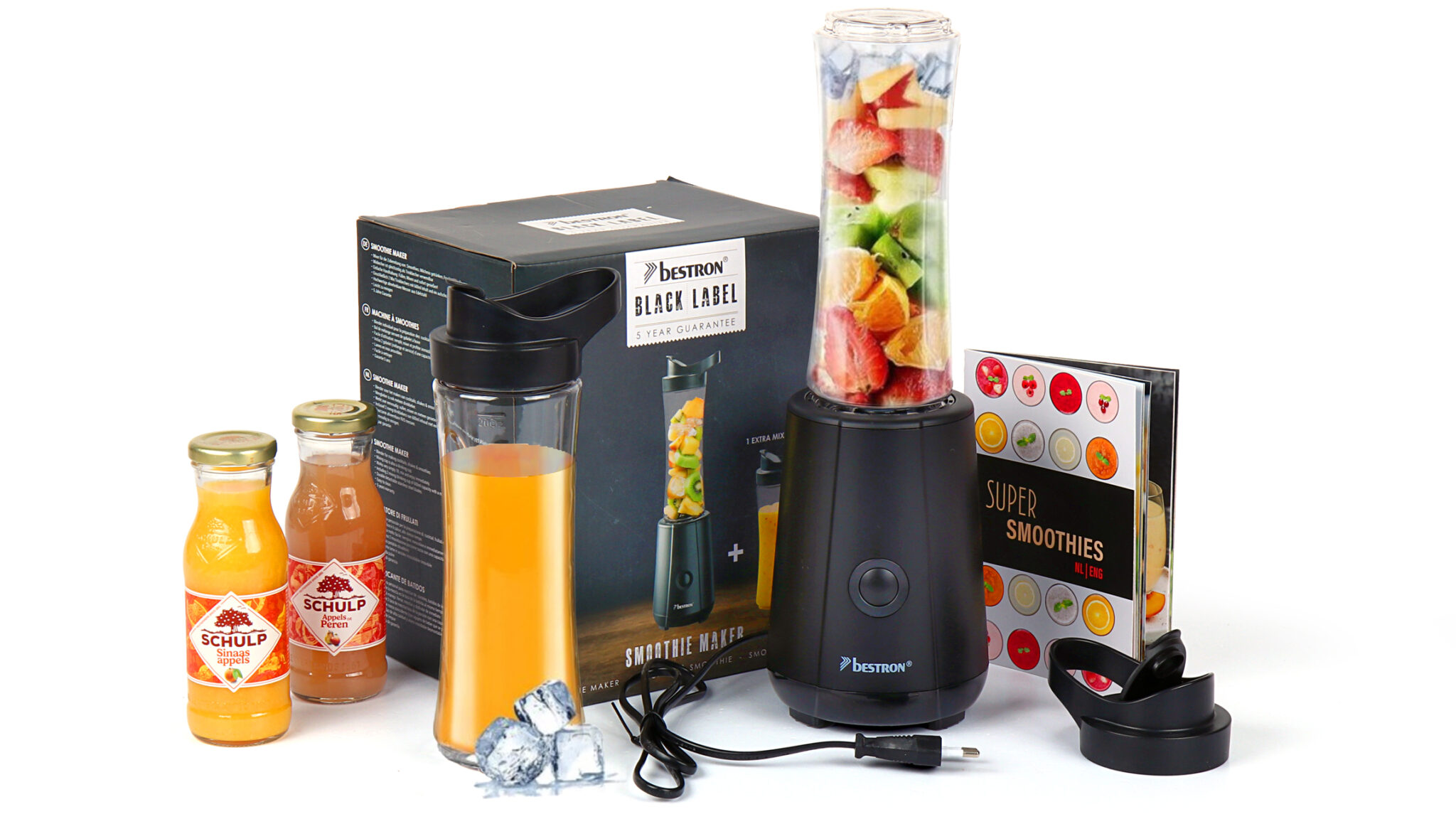 Het hart van dit pakket vormt de Bestron Smoothie maker, een handige keukenhulp voor dagelijks gebruik. Samen met het meegeleverde receptenboekje Super Smoothies in het Nederlands en Engels krijgt de ontvanger direct toegang tot kleurrijke ideeën en gezonde combinaties. De twee ambachtelijke sapjes van 20 cl – sinaasappelsap en appel & perensap – zorgen voor een perfecte start.